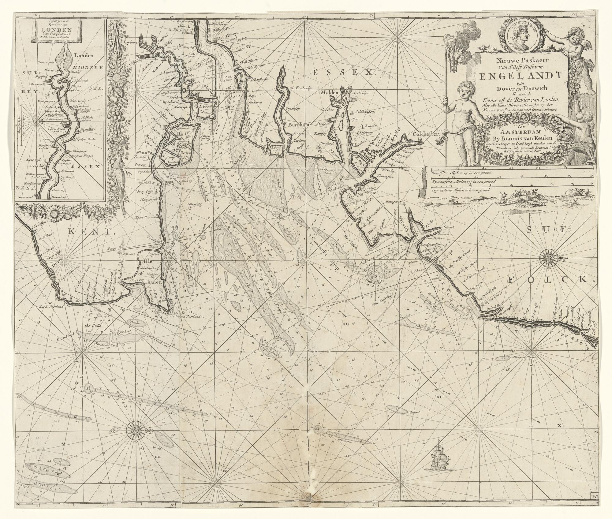 Zeekaart van de monding van de rivier Thames en tot ...