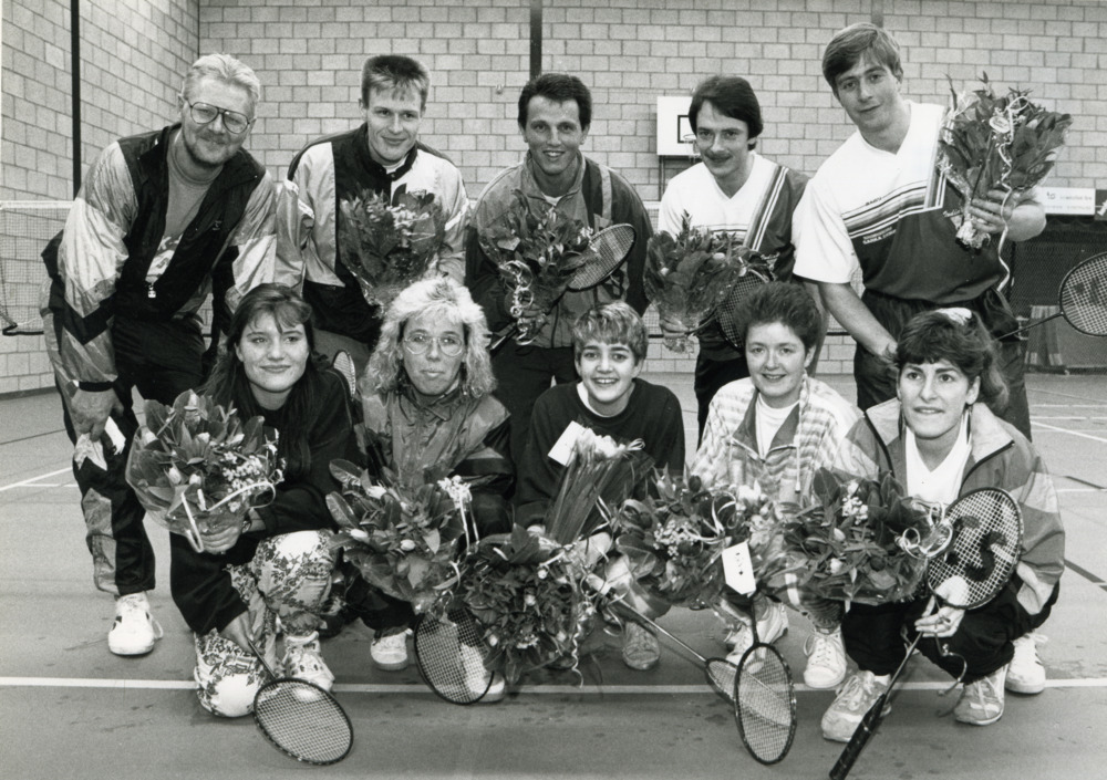 Zwart-wit foto van de badmintonclub in Herwen ca. 19...