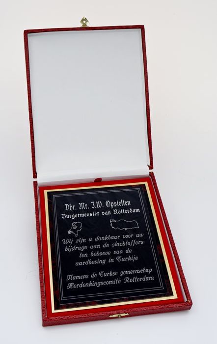 Plaquette als dank voor hulp aan de aardbevingslacht...