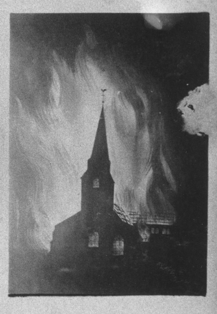 De kerk van Huissen in vlammen.Schilderij van Kees B...