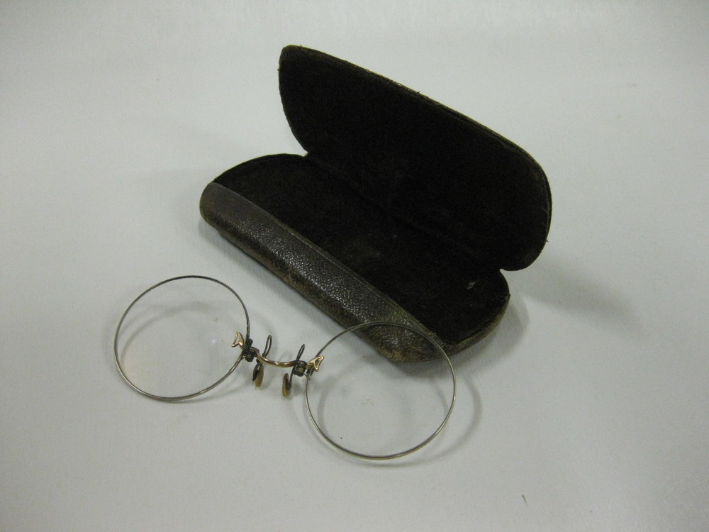 Knijpbril of pince-nez in een etui van metaal, bekle...