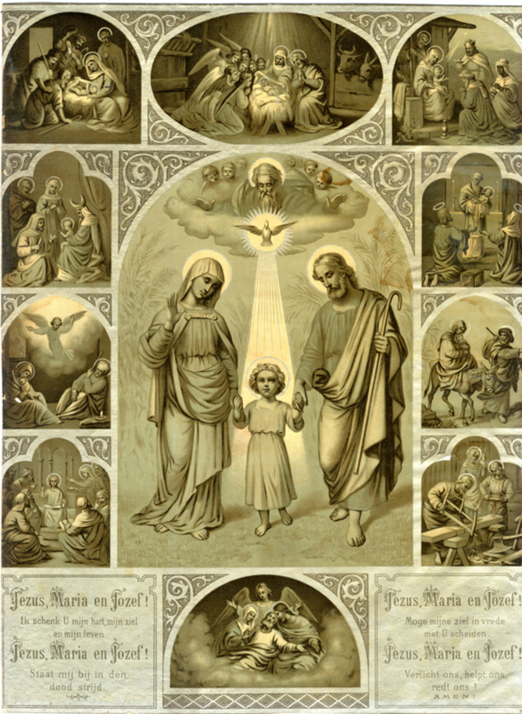Steendruk voorstellende De Heilige Familie omringd d...