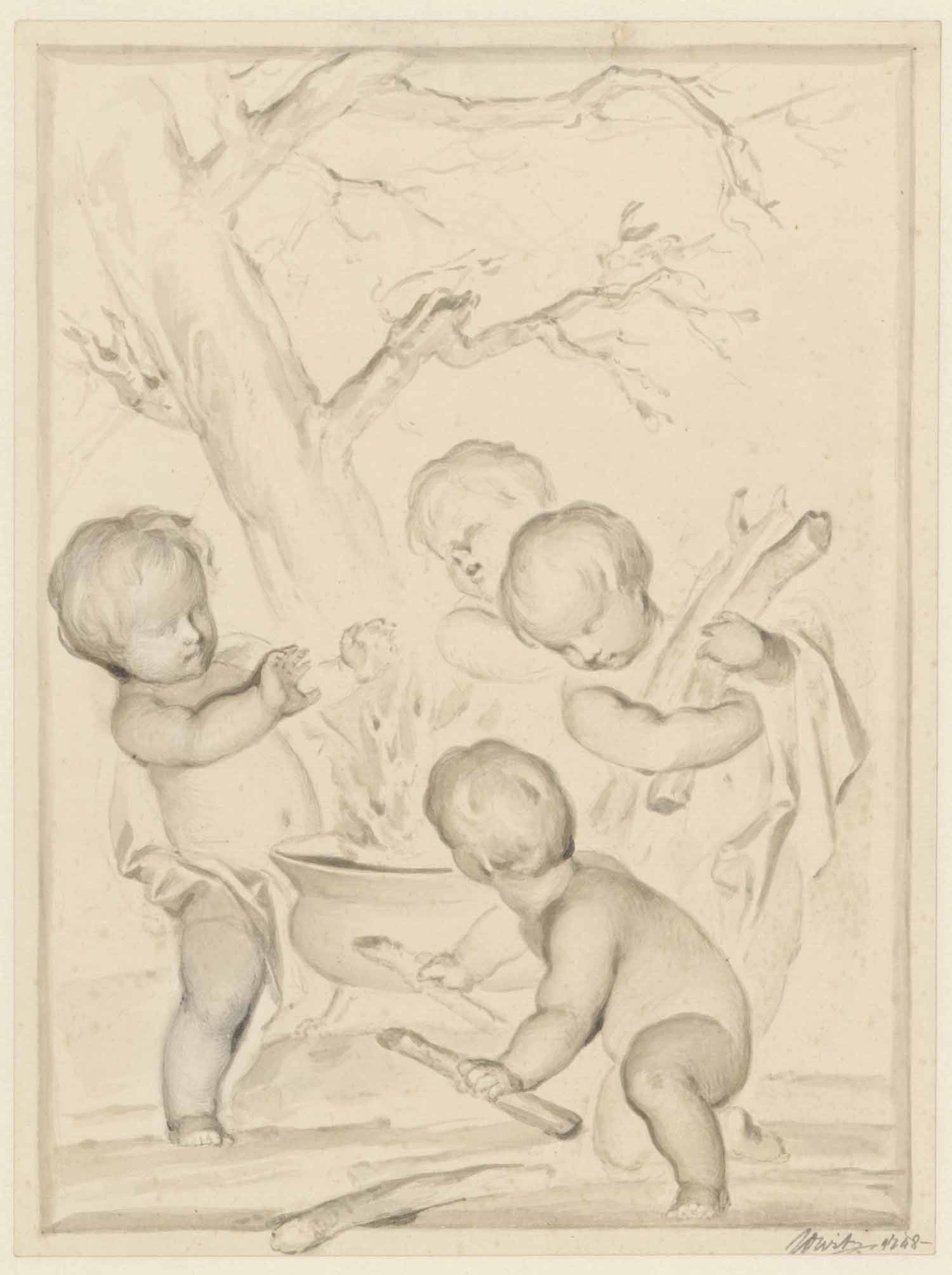Winter: vier putti bij een pot op het vuur