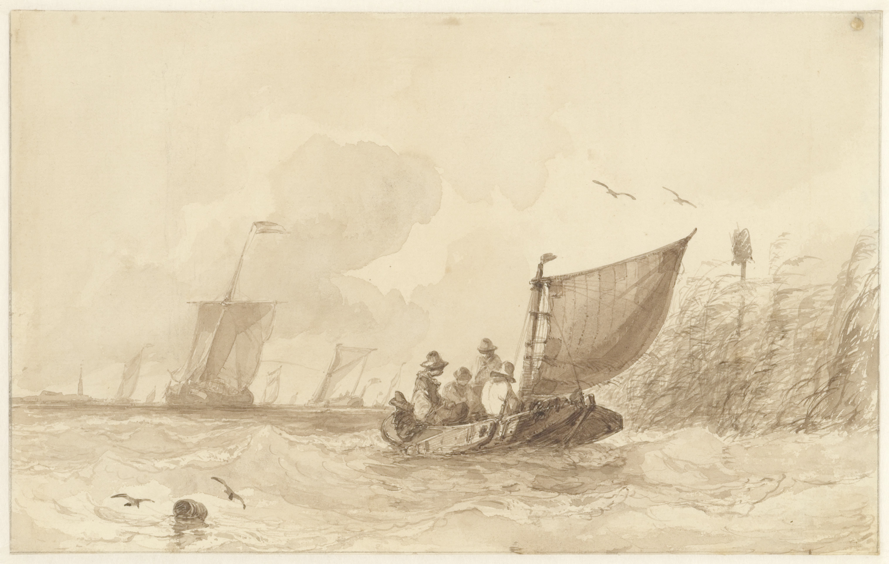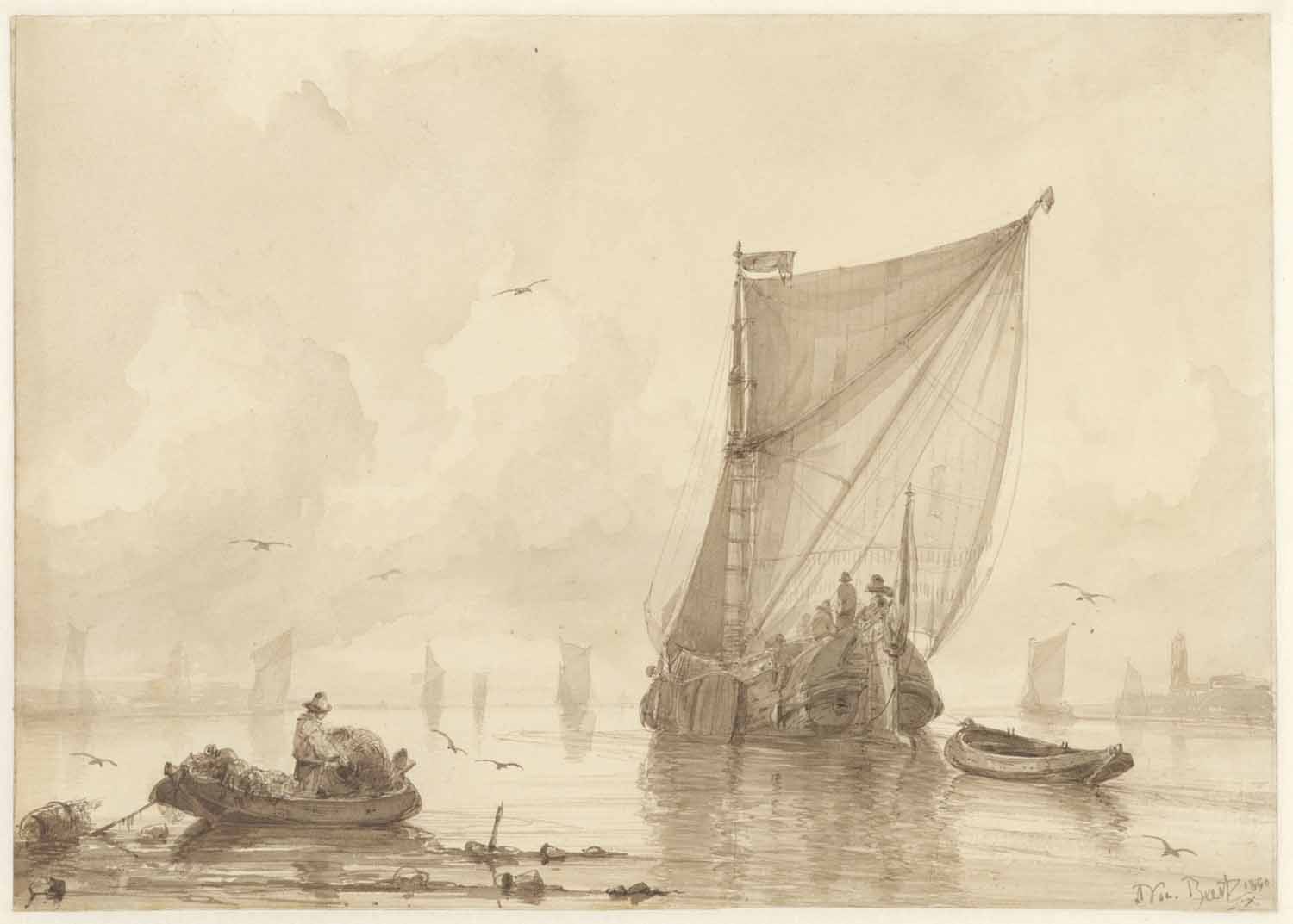Een riviergezicht met zeilende schepen