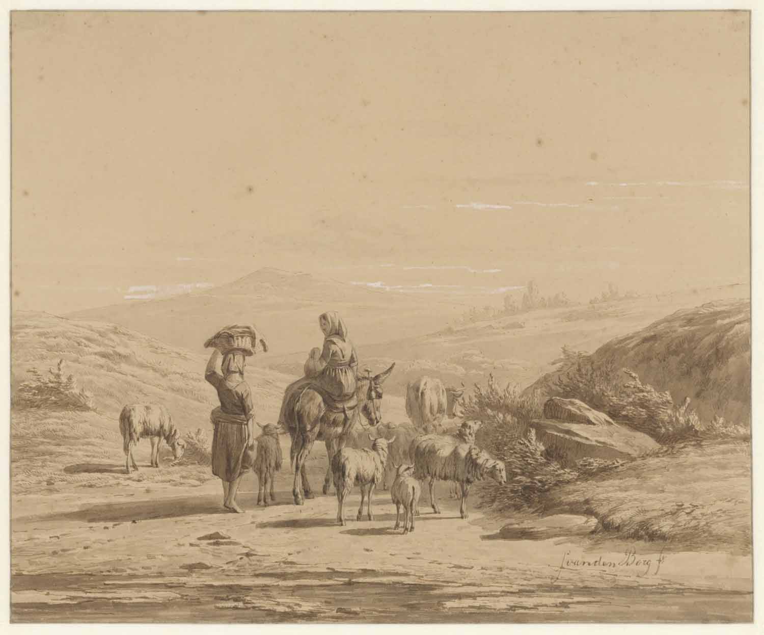 Twee vrouwen met eene kudde vee in een bergachtig la...