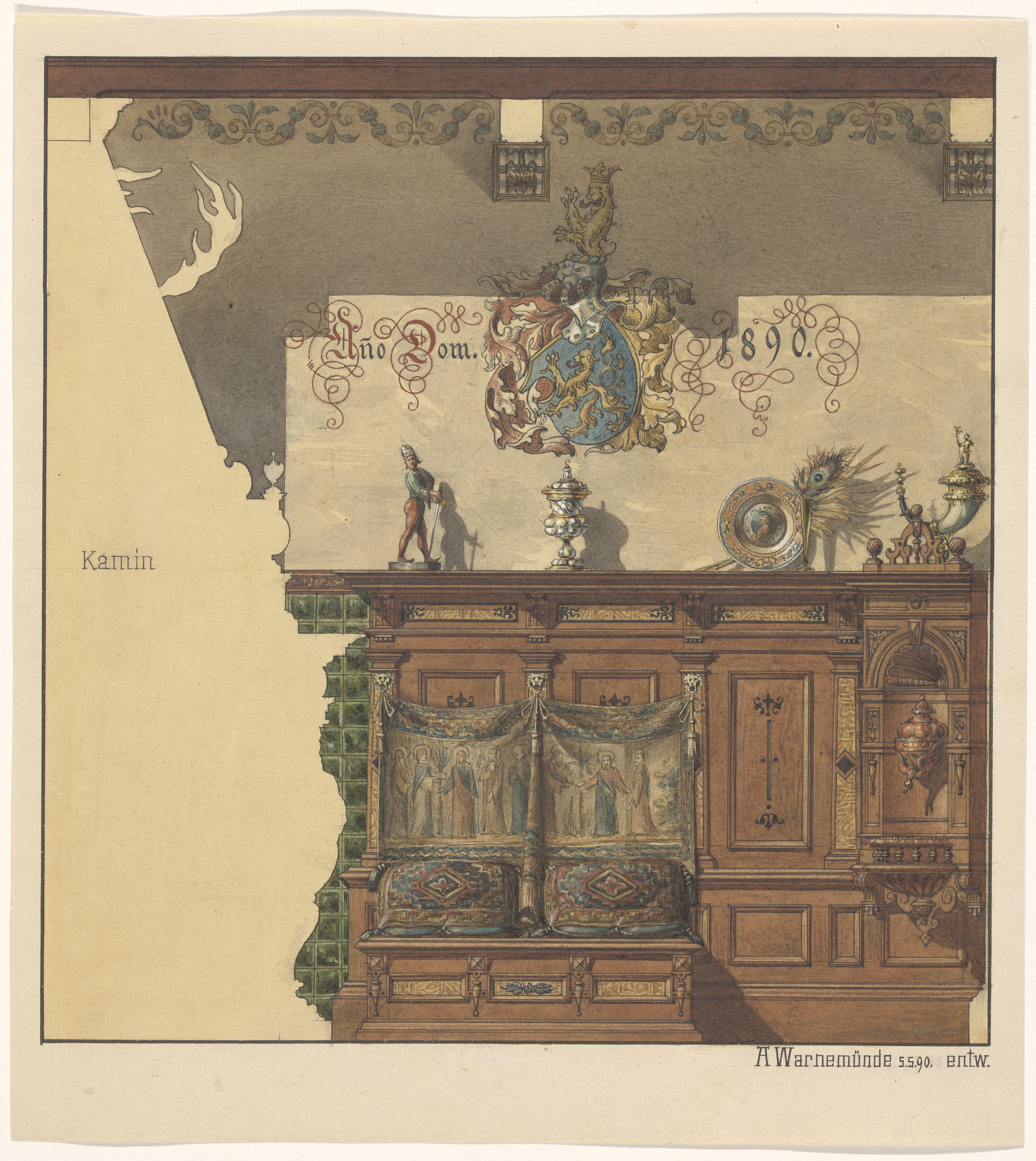 Een kamerwand in Renaissance-stijl, met een bank en ...