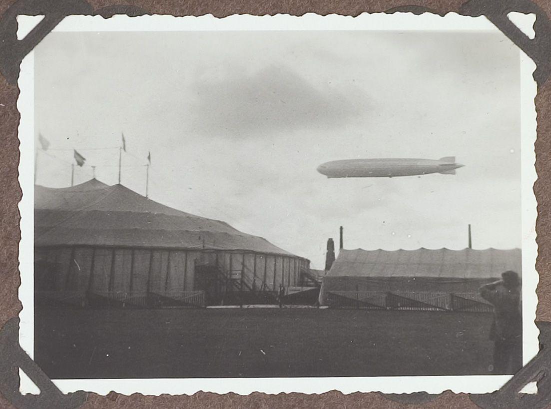 Zeppelin boven circustenten Circus Sarrasani. Foto u...