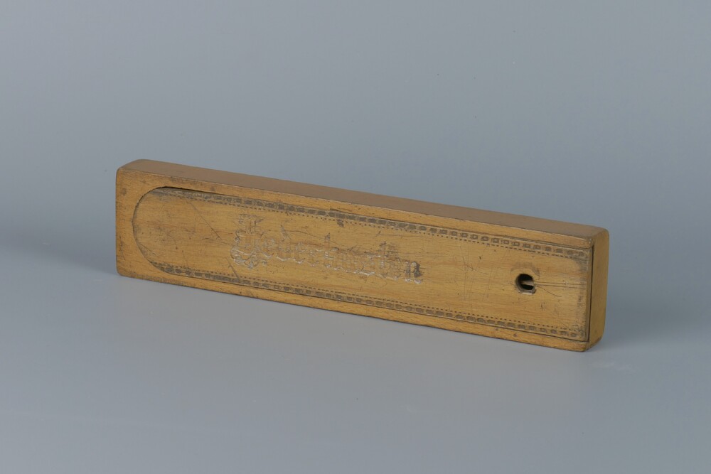 griffeldoos van hout met opschrift: Federkasten, cir...