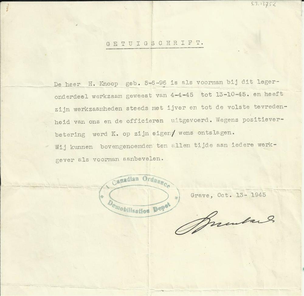 Getuigschrift van 1 Canadian Ordnance Demobilisation...