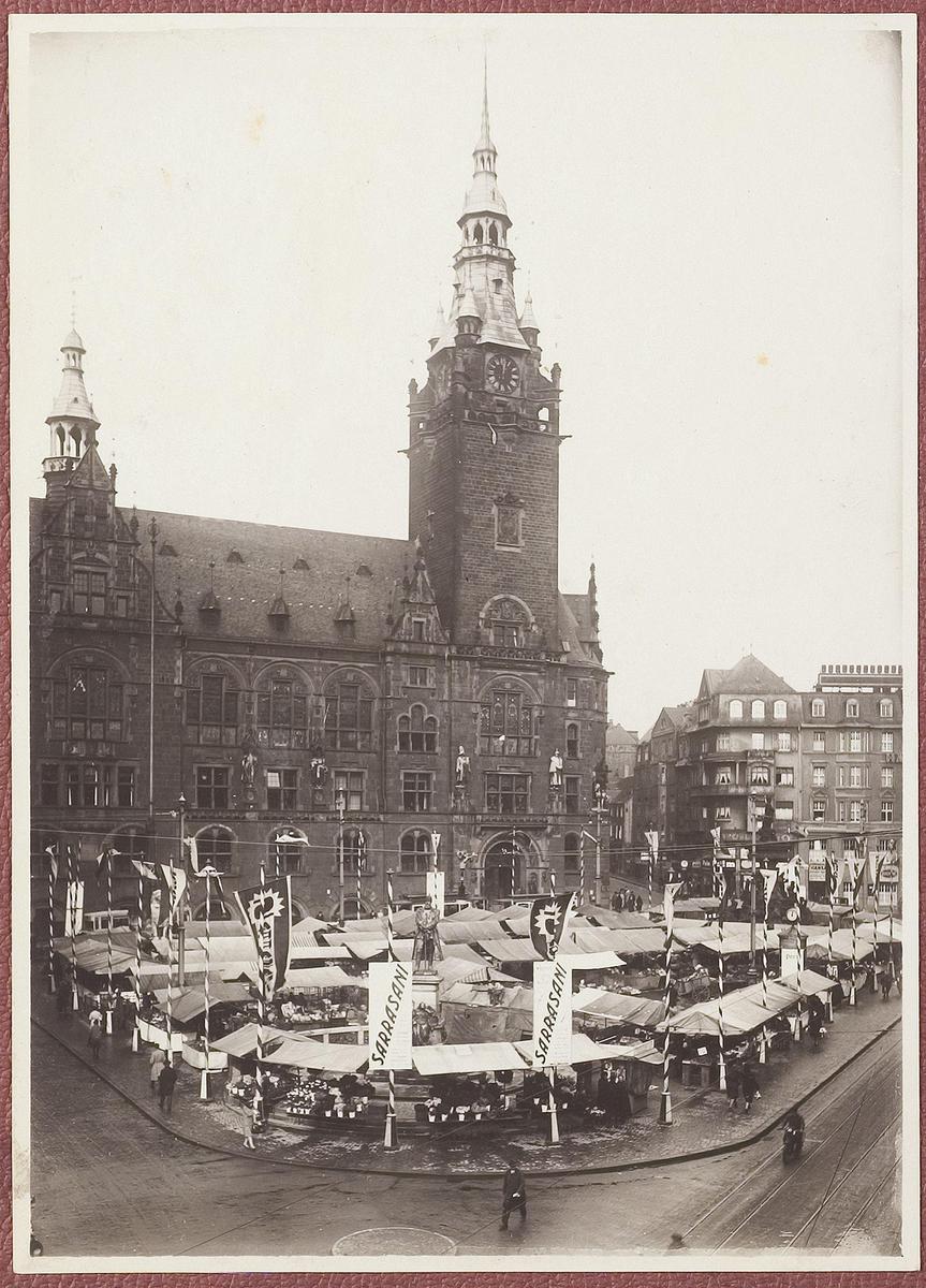 Plein met markt in Duitse stad met vaandels Circus S...