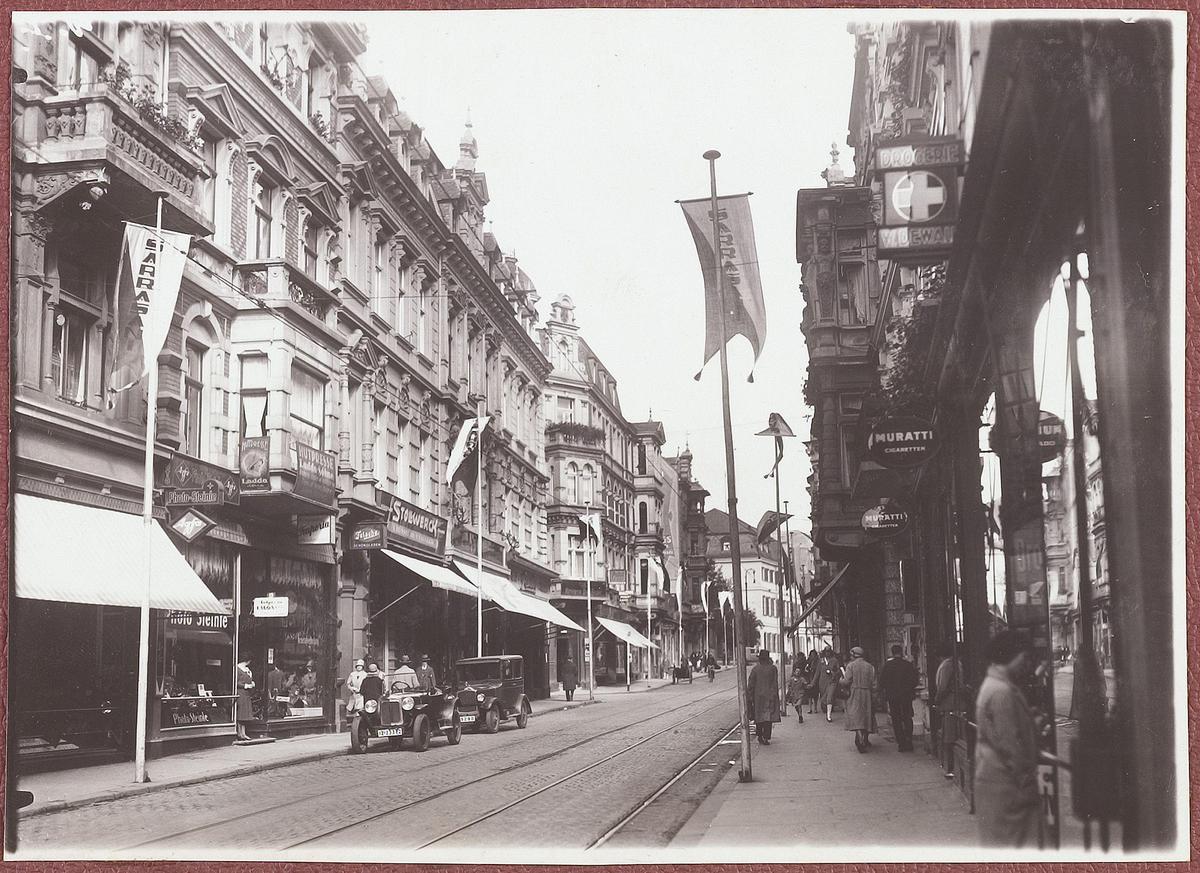 Straat in Duitse stad met vaandels van Circus Sarrasani