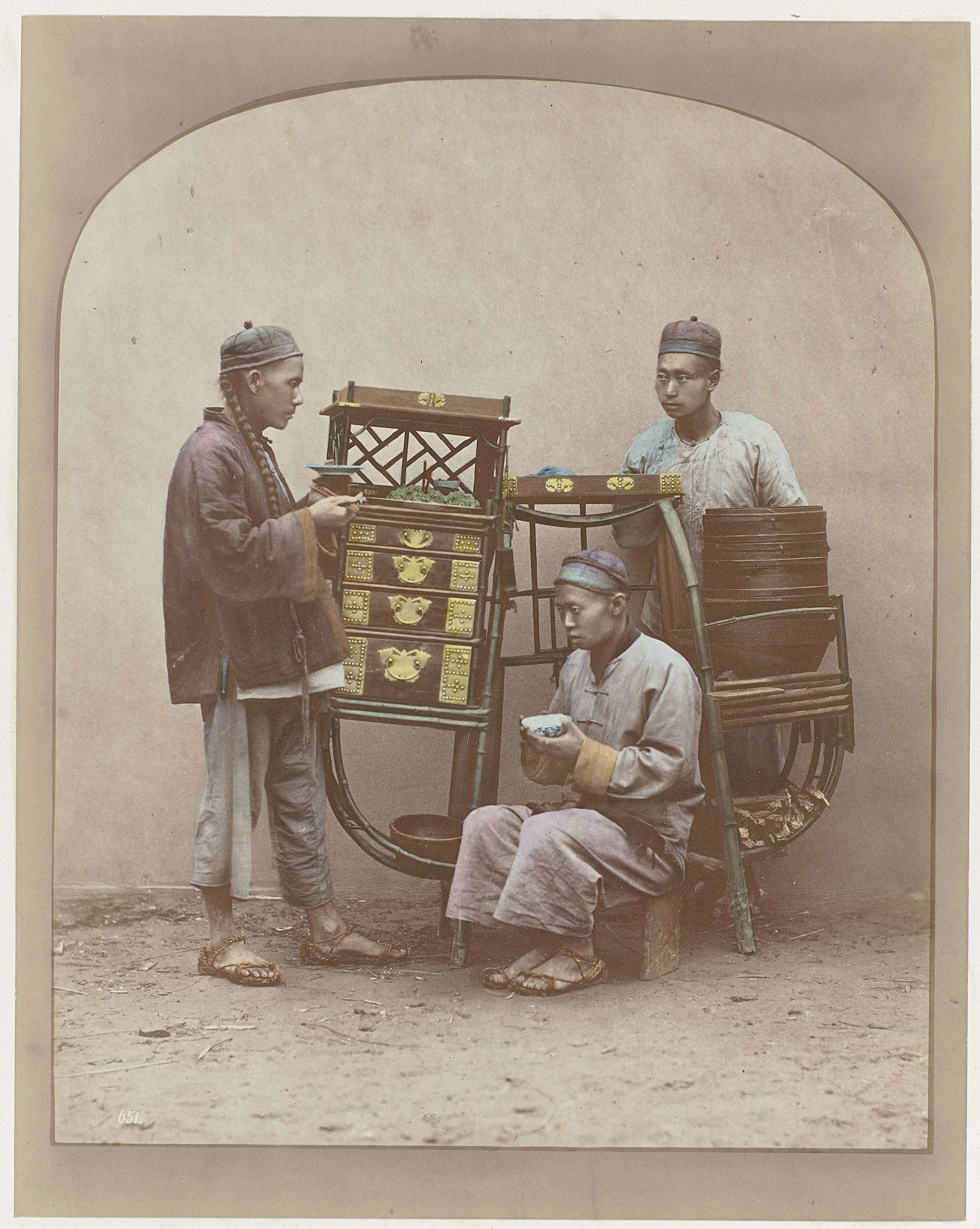 Drie Chinese kooplieden bij een wagen