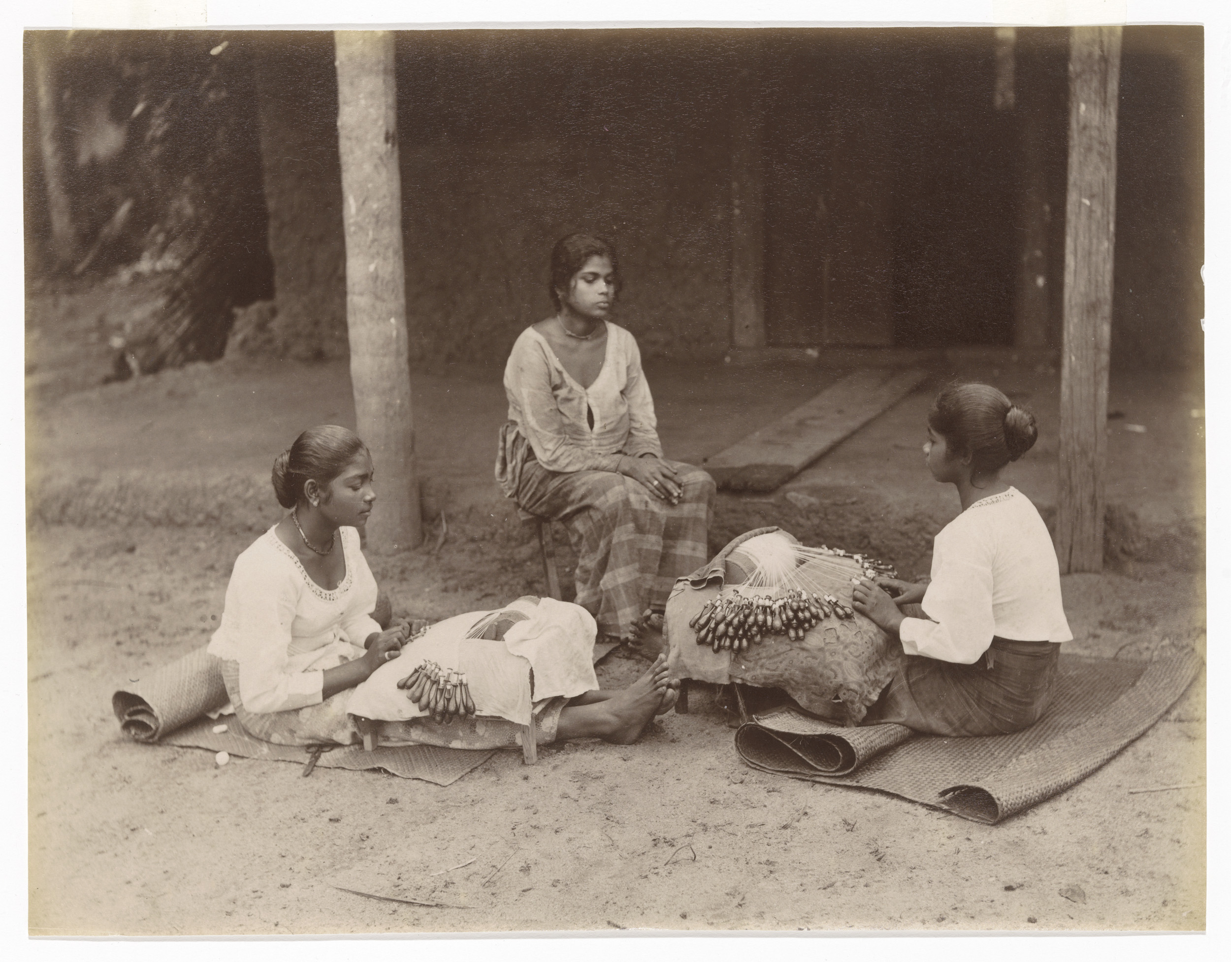 Three young women waving lace in Galle, Sri Lanka