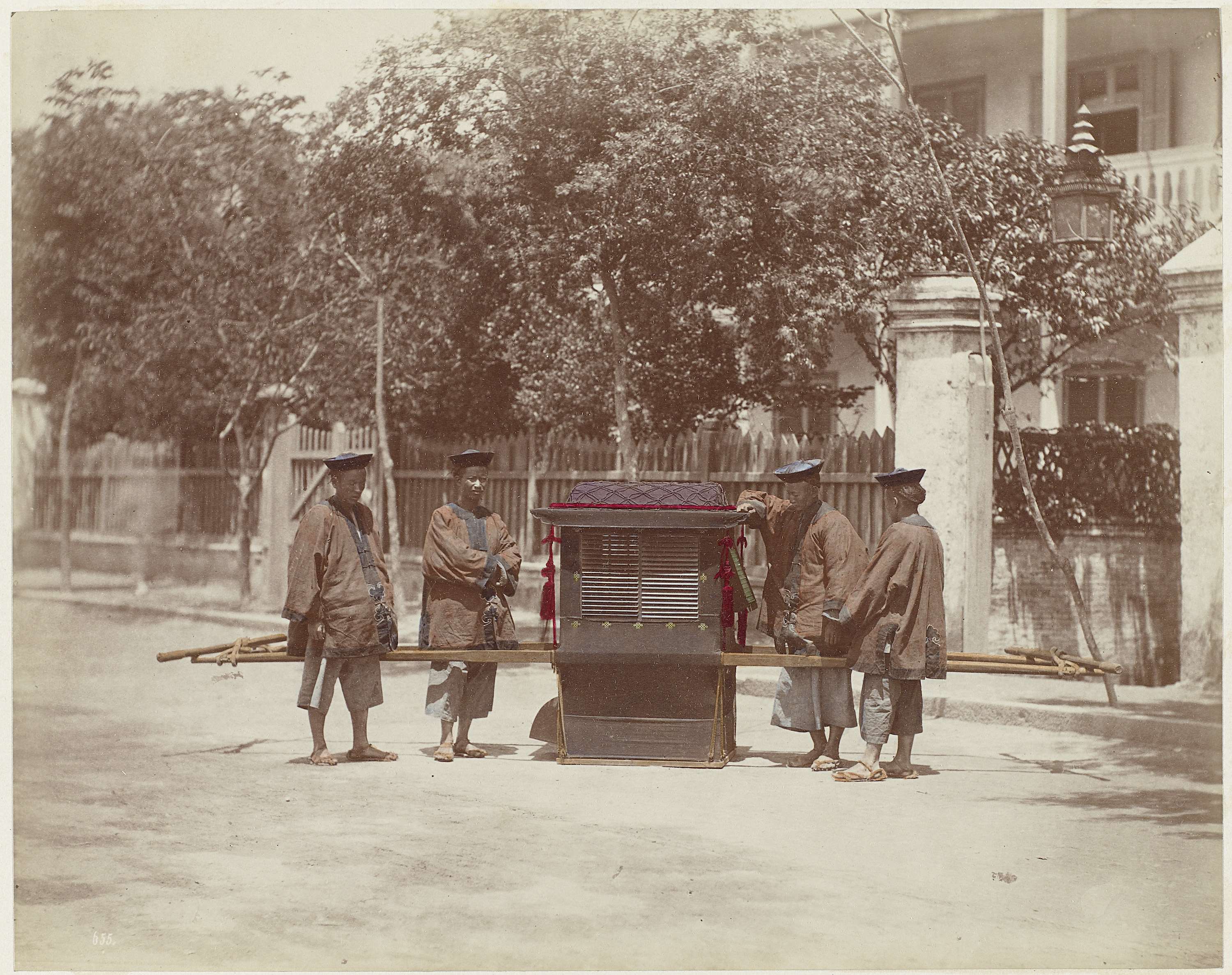 Vier mannen met draagstoel op straat te China