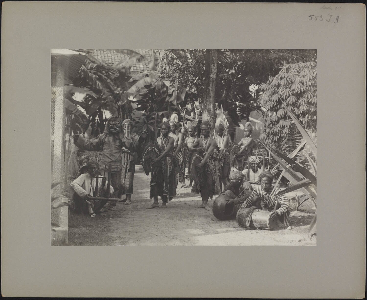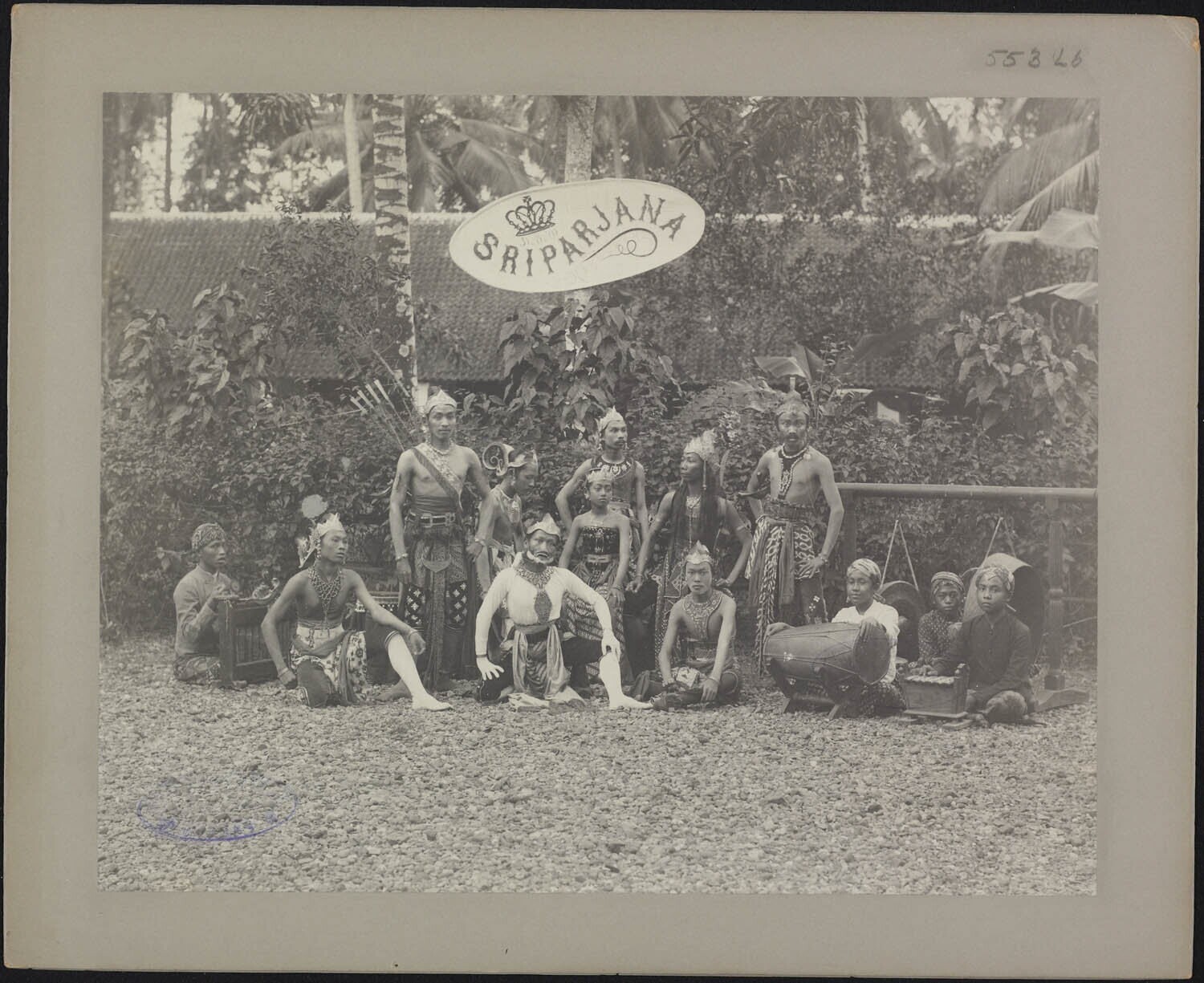 Groepsportret van Wajang Wong dansers met Gamelan mu...