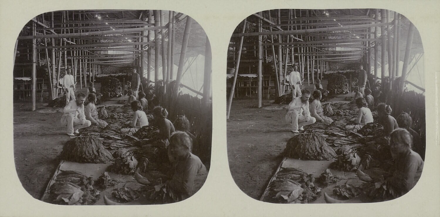 'Tabakscultuur. Sorteeren van Tabaksbladeren.'