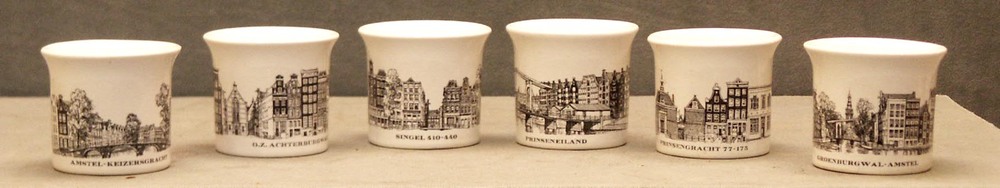 eierdopjes van aardewerk, bedrukt met Amsterdamse vo...