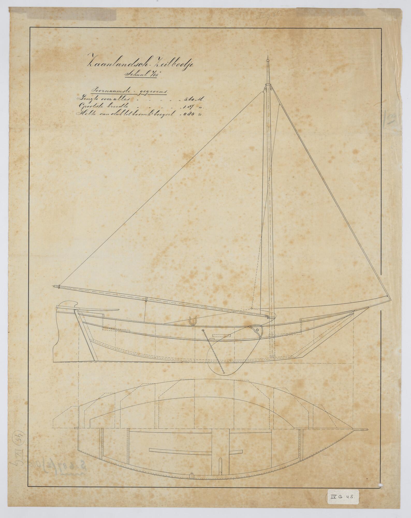 Zijaanzicht met zeilplan, bovenaanzicht met spanten,...