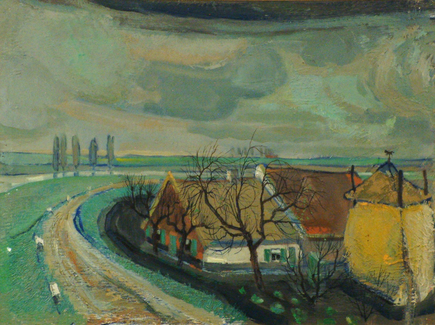 Rivierlandschap met een boerderij achter de dijk.
