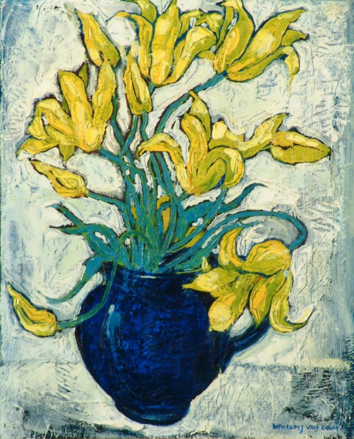 Gele tulpen in een blauwe pul