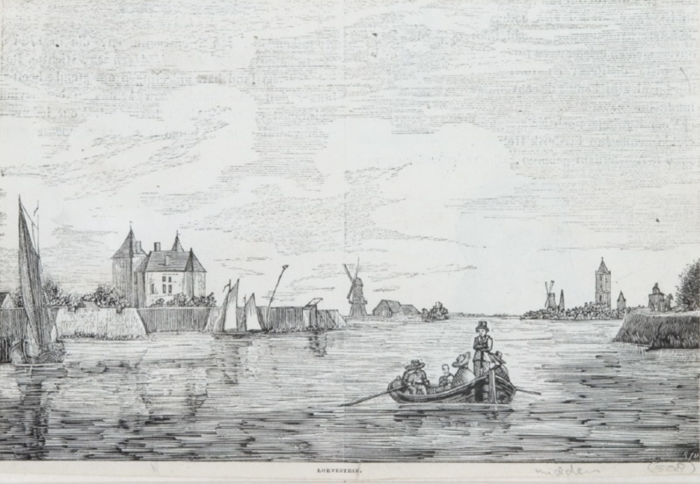 Rivieraanzicht van Slot Loevestein (NW), houtgravure...