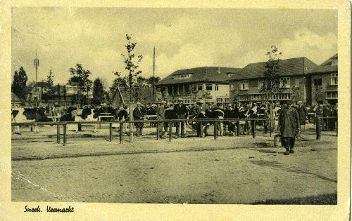 prentbriefkaart in zwart-wit van de veemarkt in Snee...