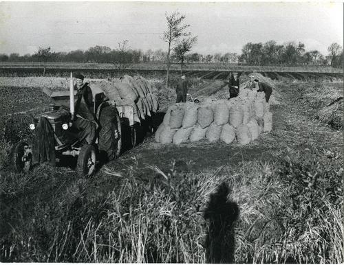 Foto in zwart-wit van het vullen van zakken bij een ...