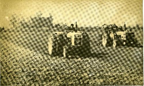 Foto in zwart-wit van een drie-rijige aardappelpootm...