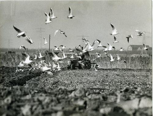 Foto van een groep meeuwen boven omgeploegd land doo...