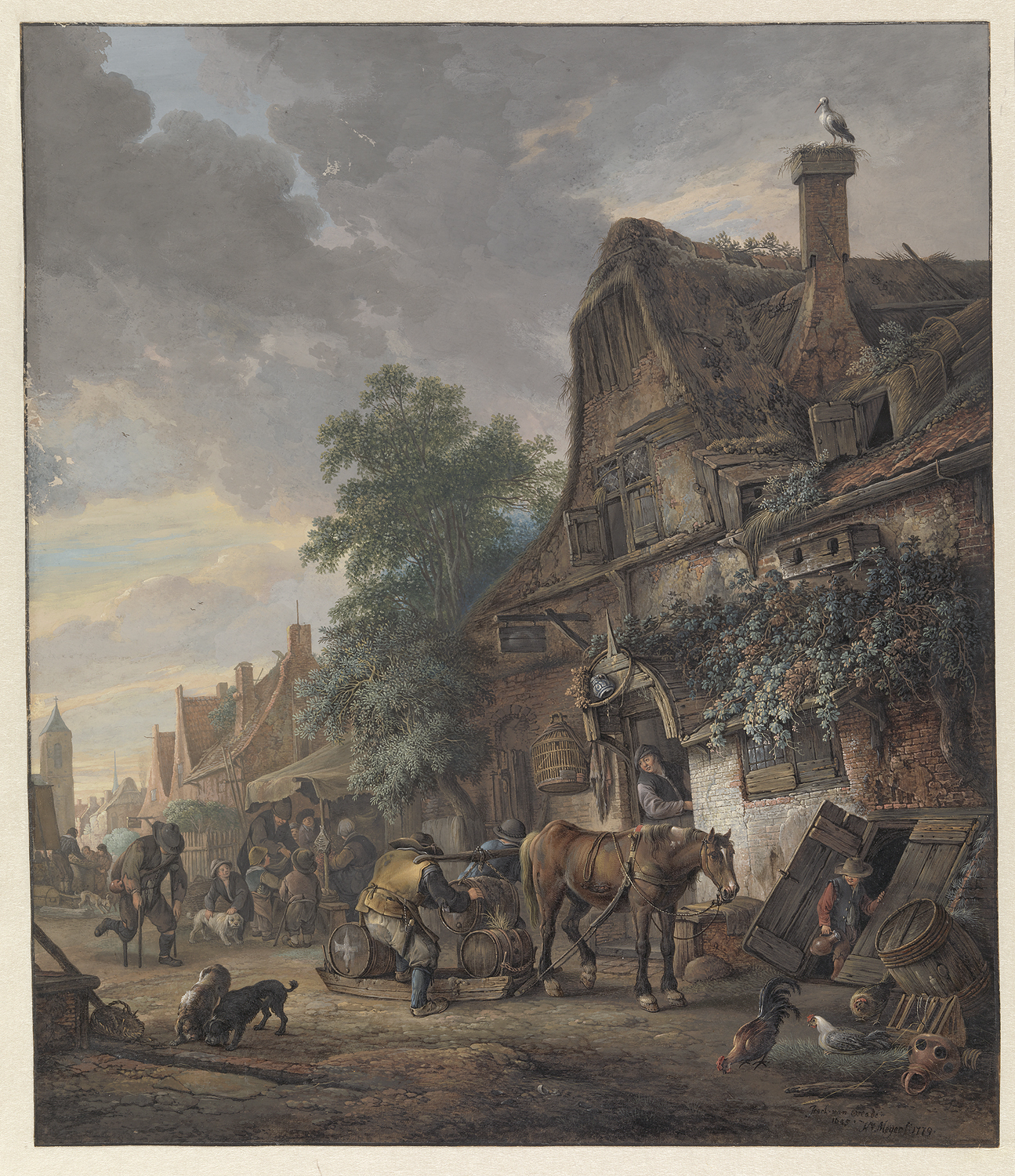 Het uitladen van vaten voor een herberg, naar een sc...