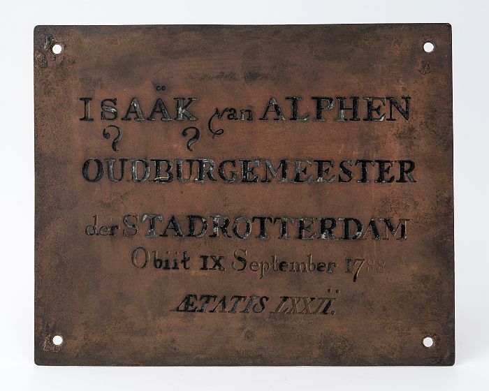 Koperen naamplaat uit 1788 met "Isaäk van Alphen ..."