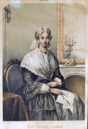 Ingekleurde gravure 'Eene Friesche Jufvrouw' in lijst