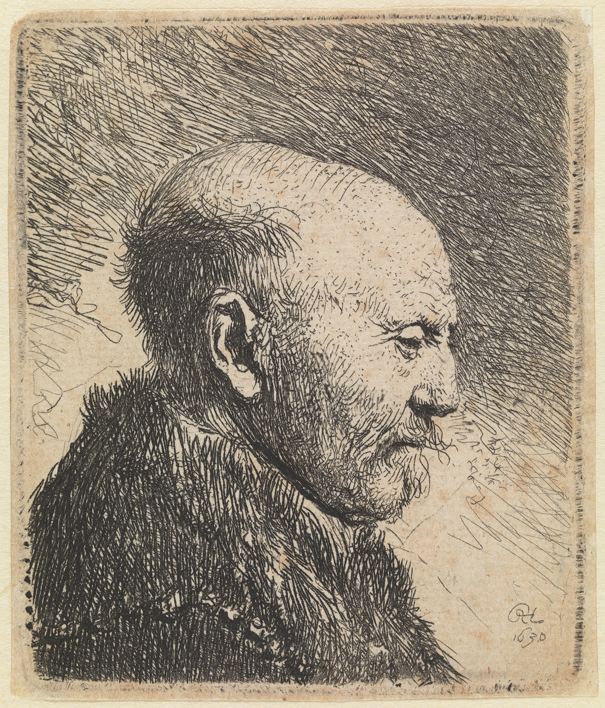 Kaalhoofdige oude man: profiel naar rechts; de vader...