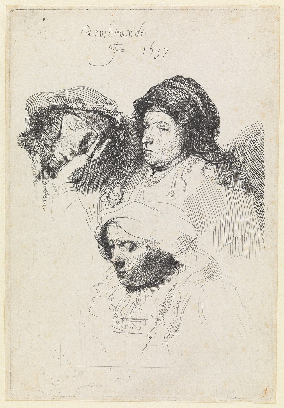 Drie vrouwenhoofden waaronder een slapende