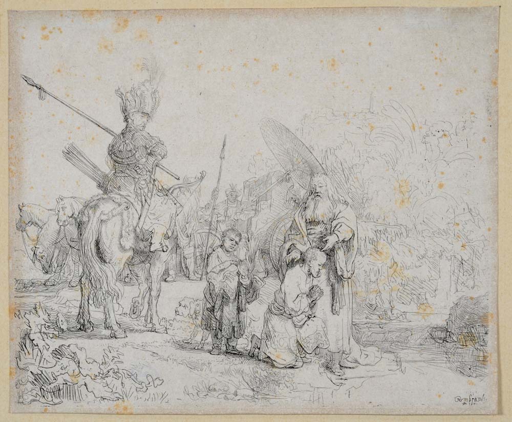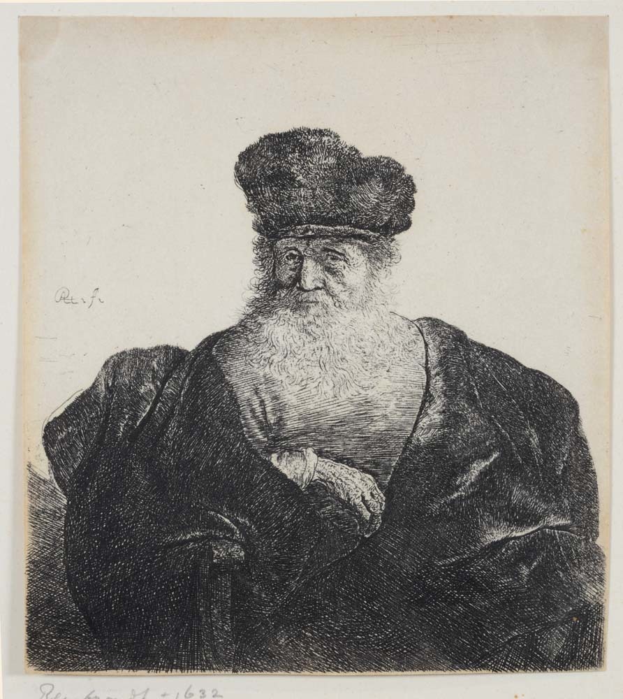 Oude, bebaarde man met bontmuts en fluwelen mantel