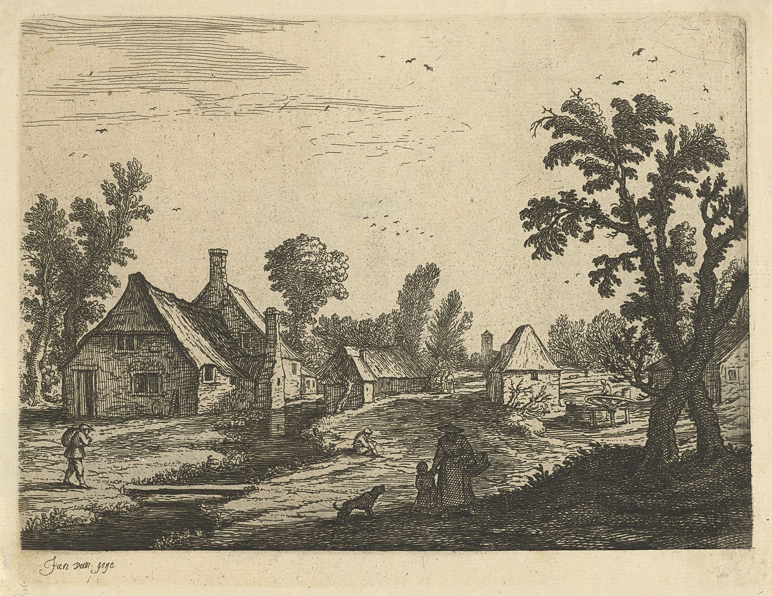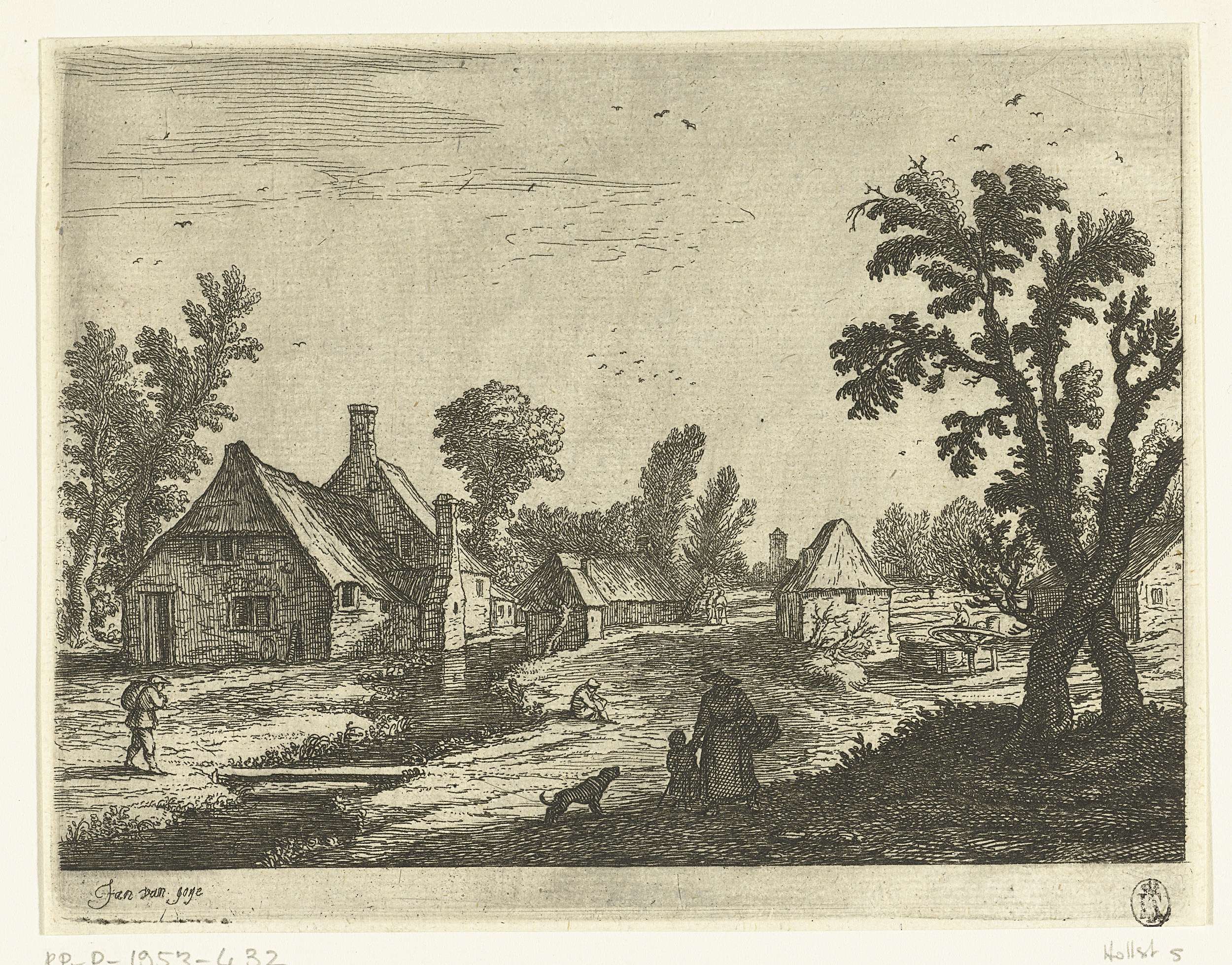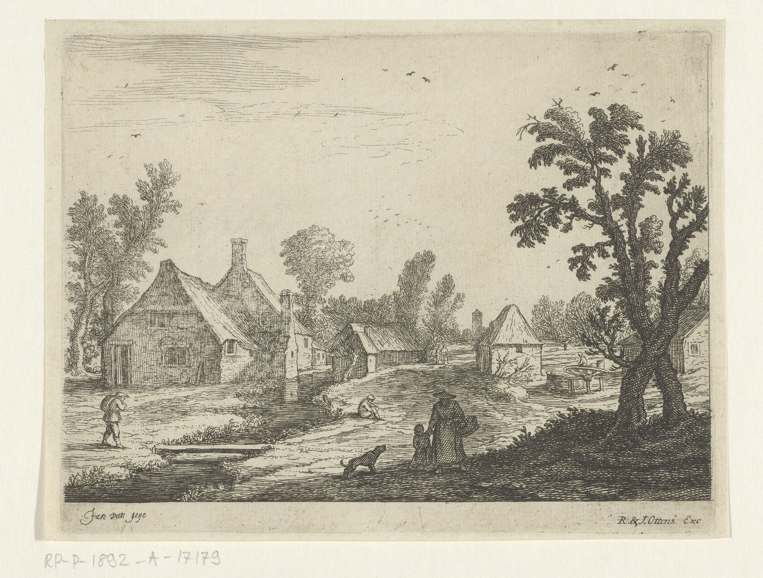 Dorpsgezicht met vrouw en kind in de dorpsstraat