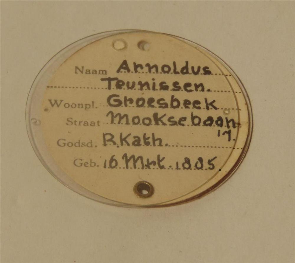 Identiteitsplaatje van slachtoffer meidagen 1940. Te...