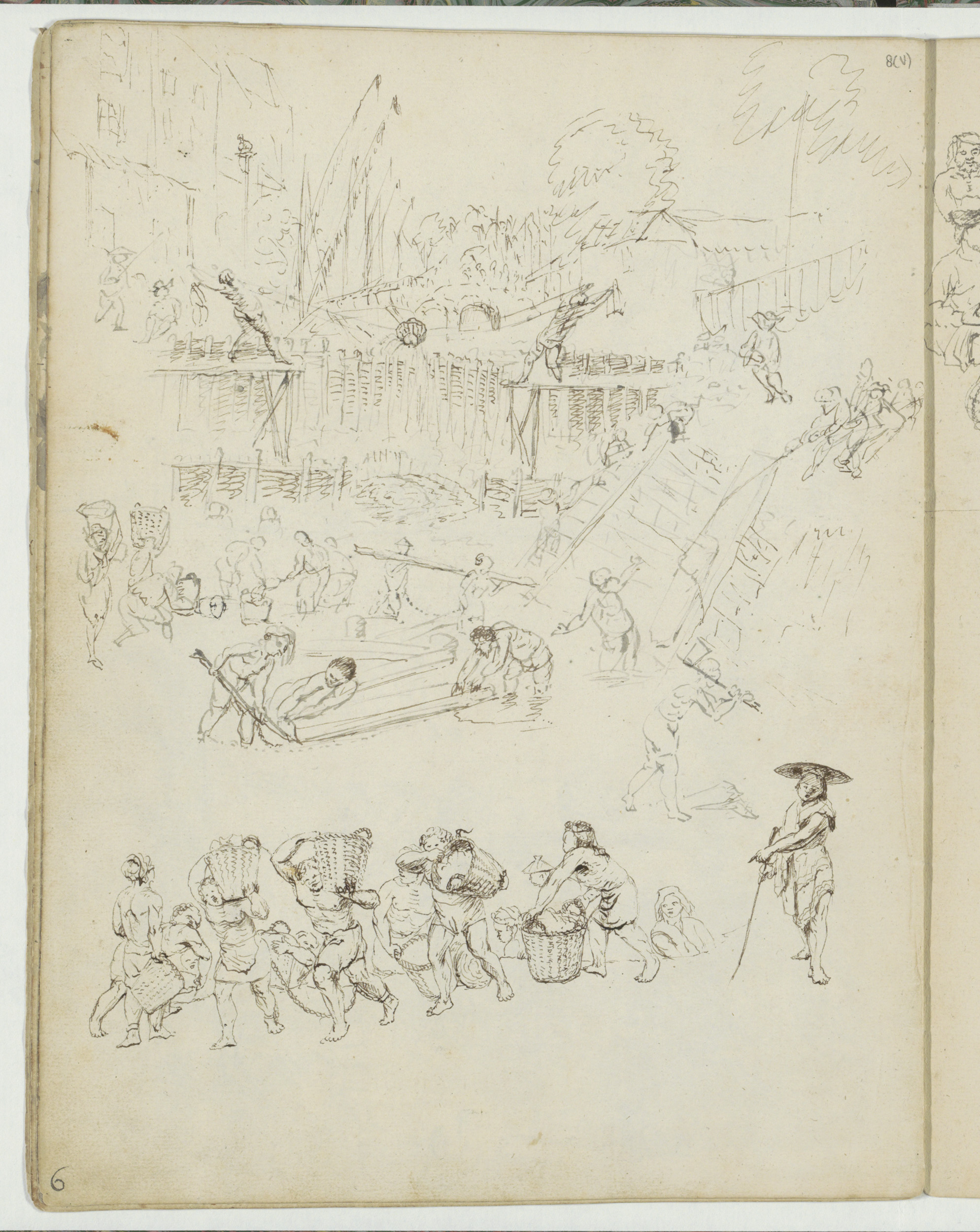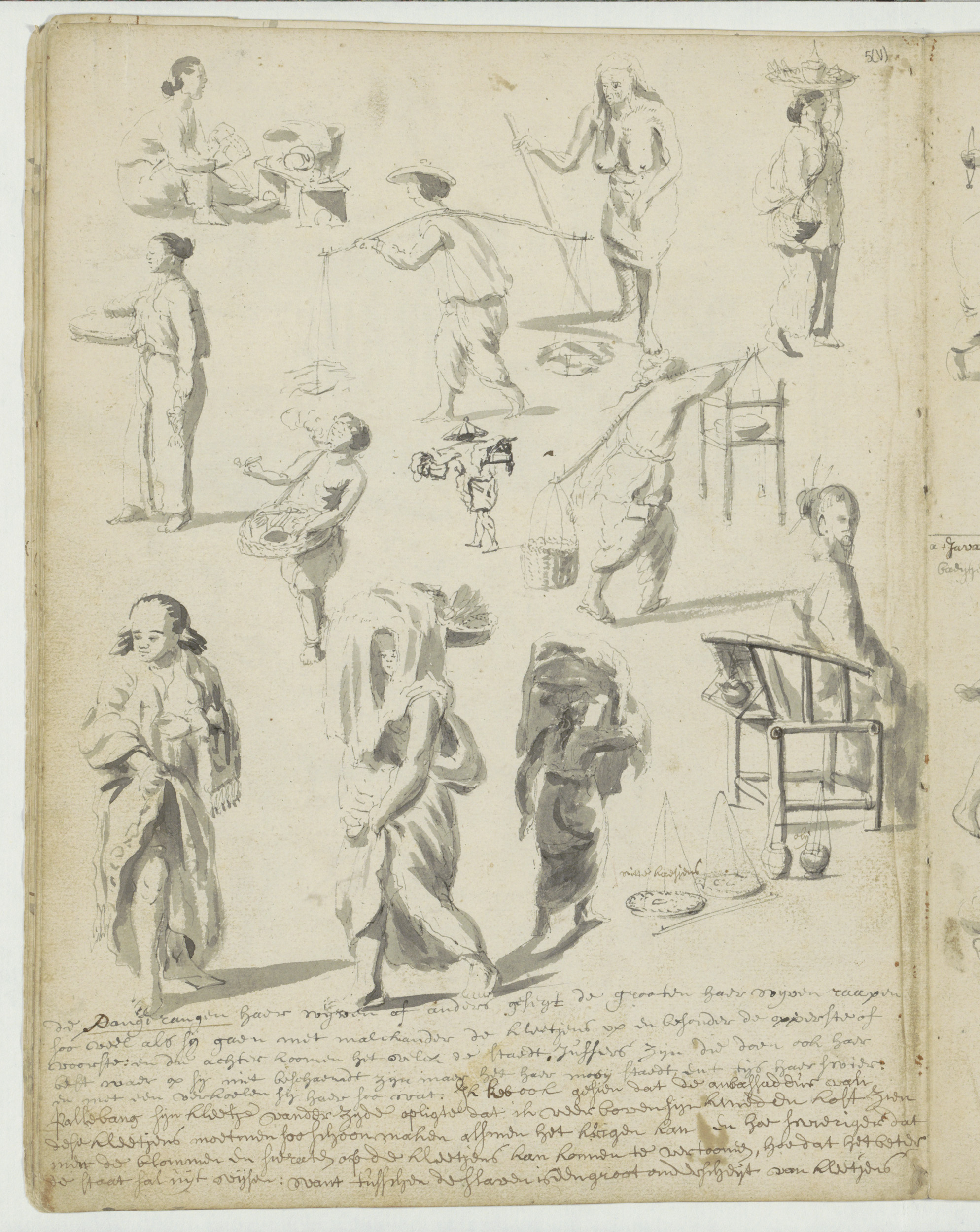 Studieblad met lastdragers, dansers en vrouwen met m...