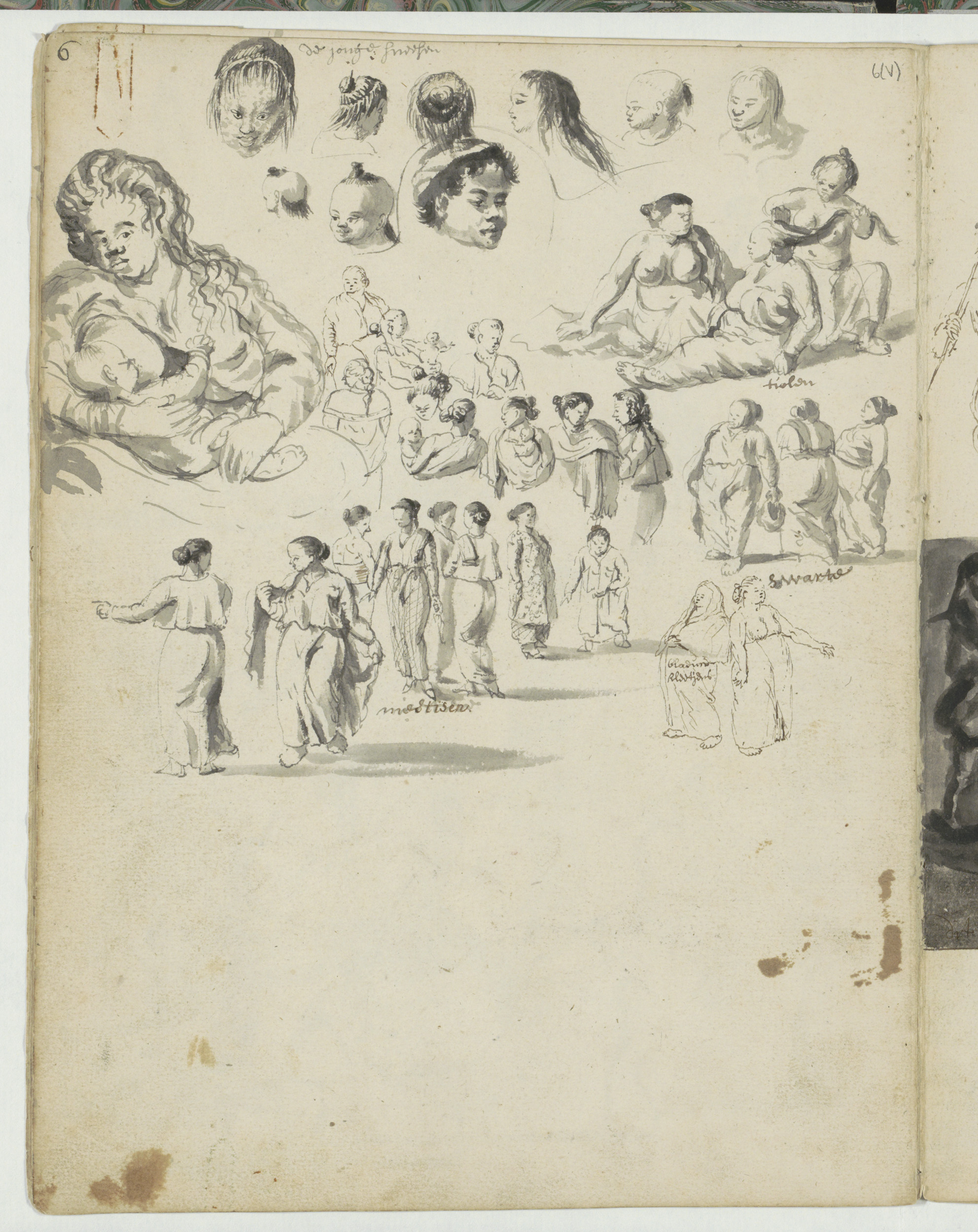 Studieblad met vrouwen, haardrachten en moeders met ...