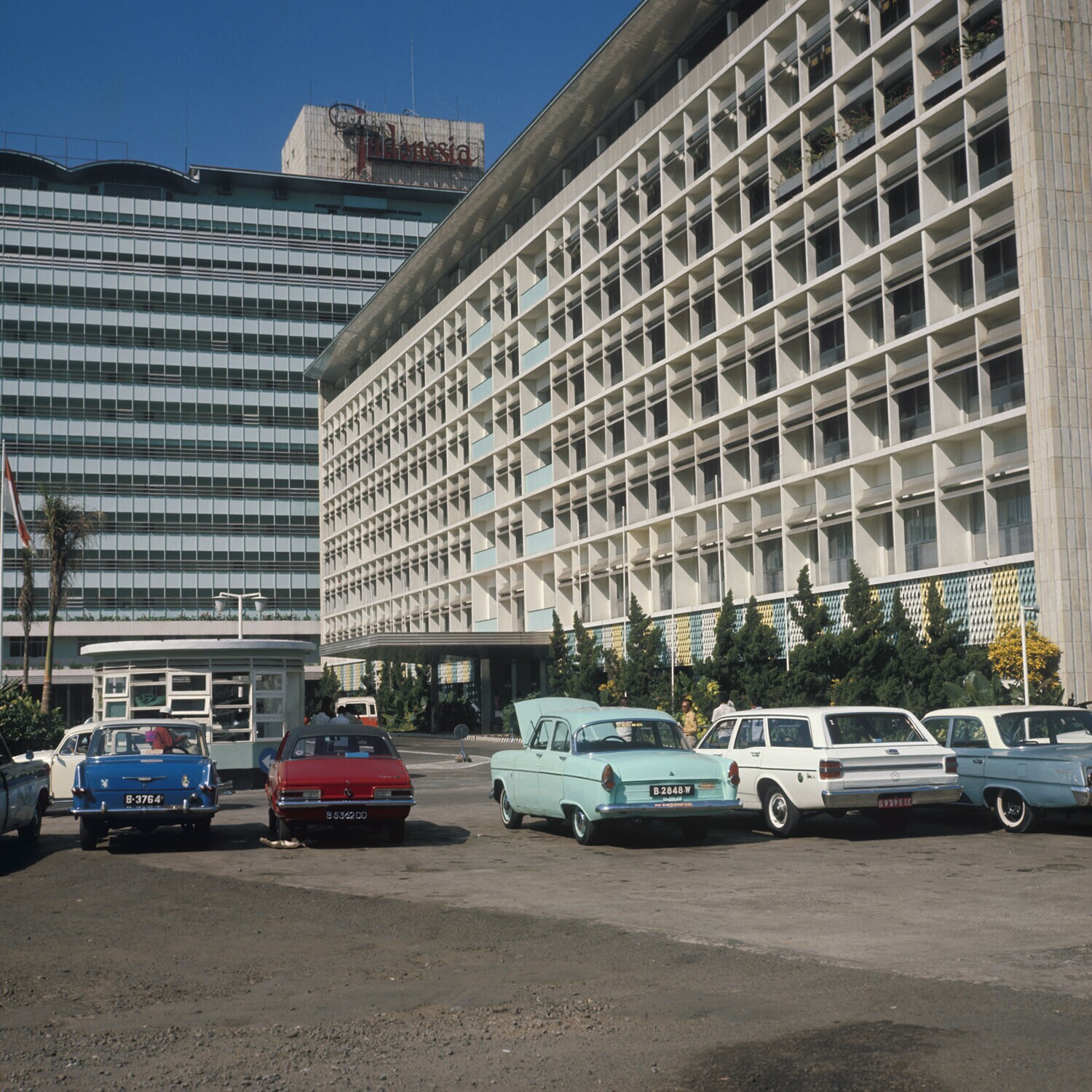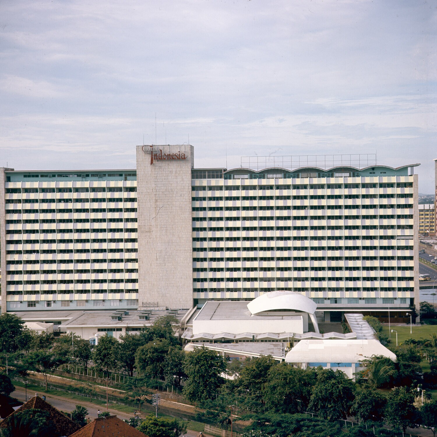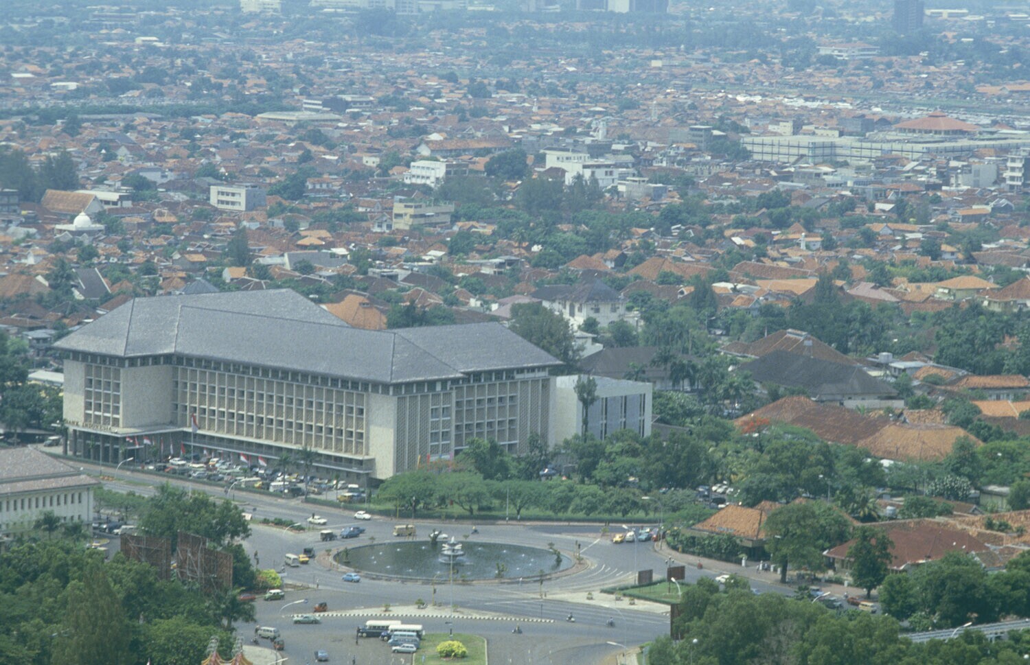 Gezicht op Jakarta met op de voorgrond het gebouw va...