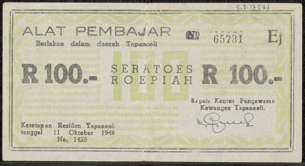 Bankbiljet van 100 roepiah van Alat Pembajar (Repoeb...