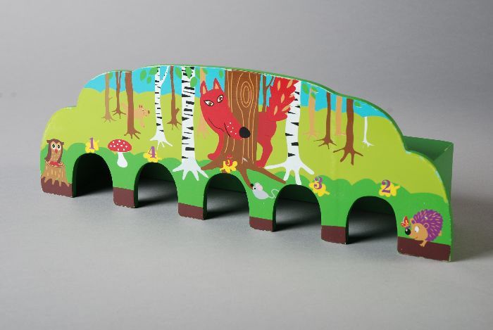 Houten trekkast met veelkleurige kartonnen plaat met...
