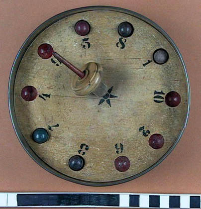 Knikkerspel bestaande uit een ronde houten schijf me...