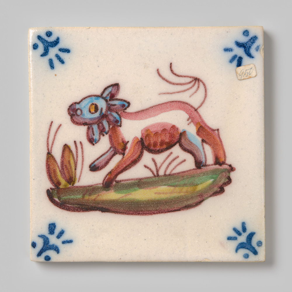 Tegel van keramiek met tinglazuur, voorstellende: le...