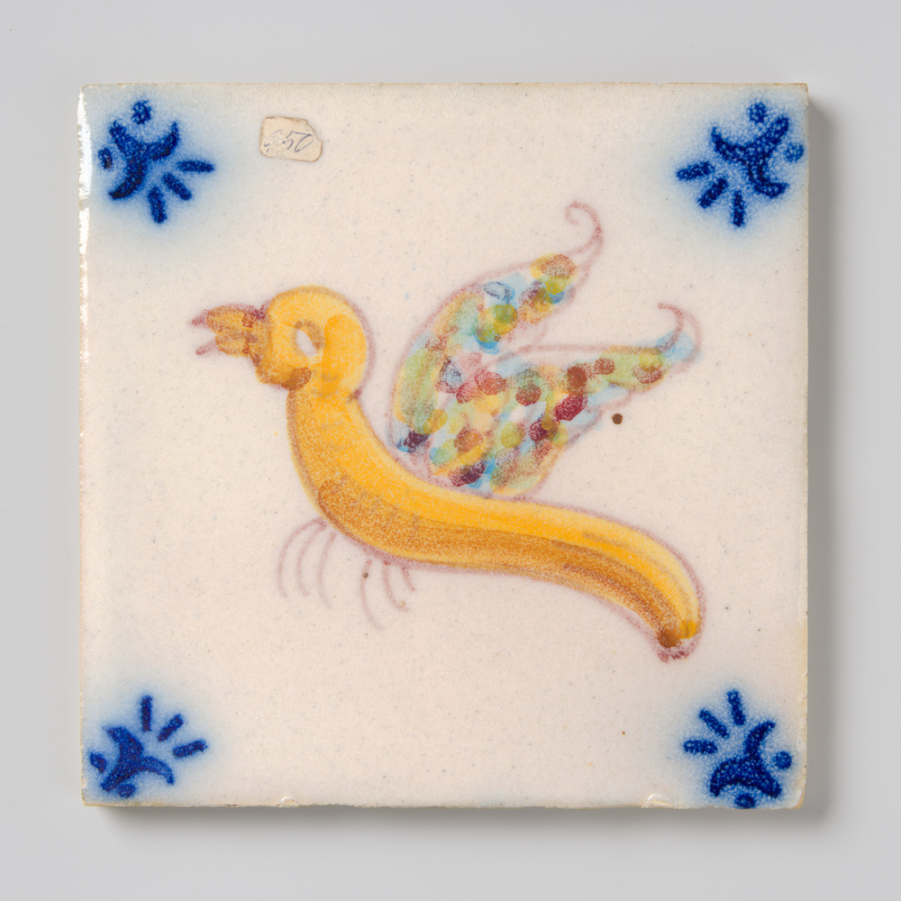 Tegel van keramiek met tinglazuur, voorstellende: vo...