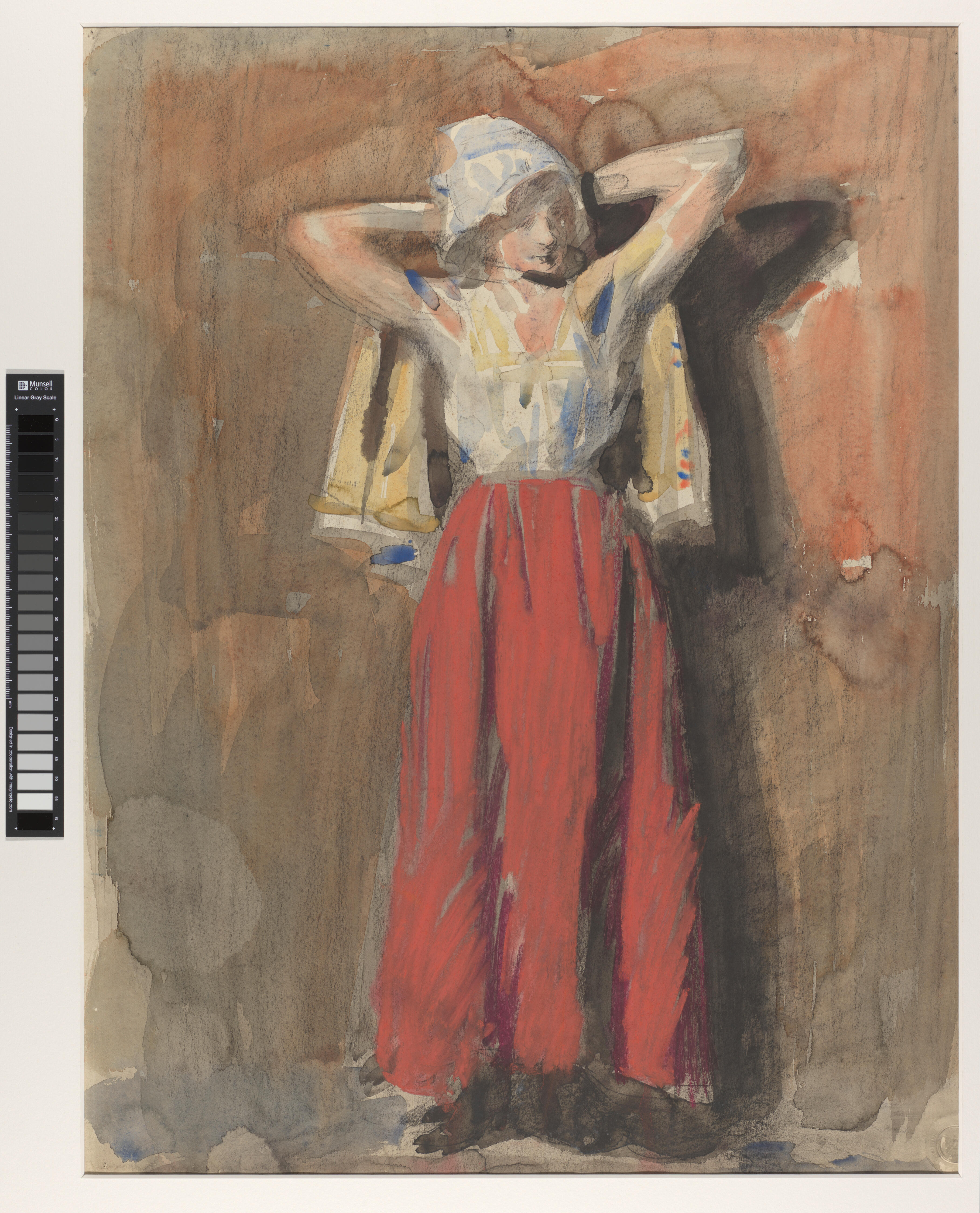 Tekening van een staande vrouw in een rode rok