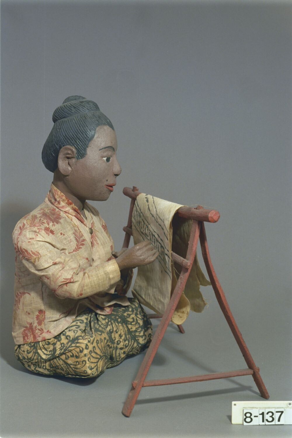 Houten pop van een batikster aan haar batikrak, kato...