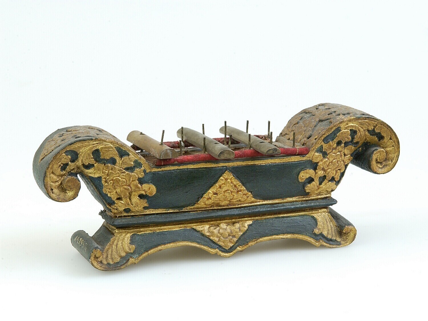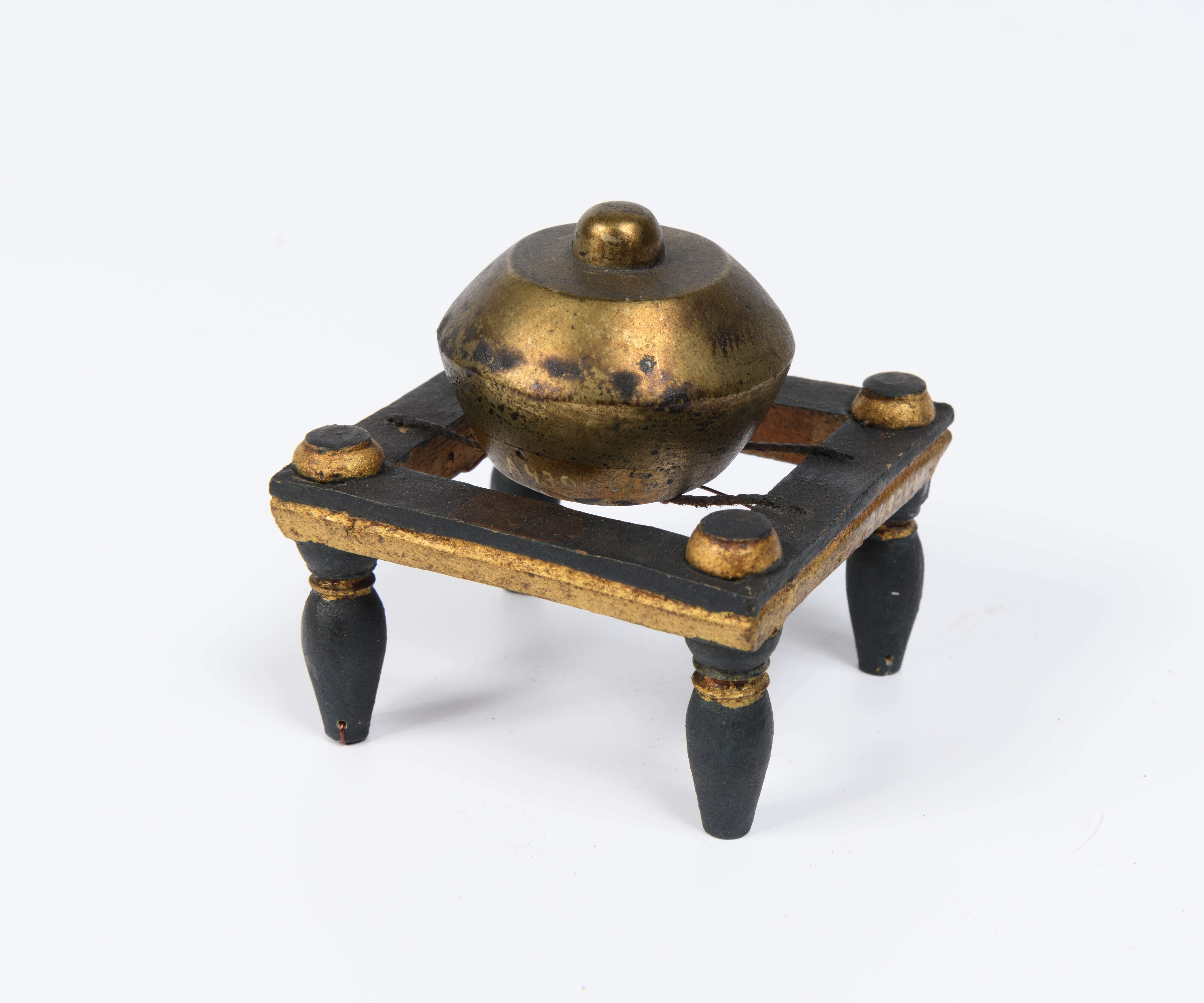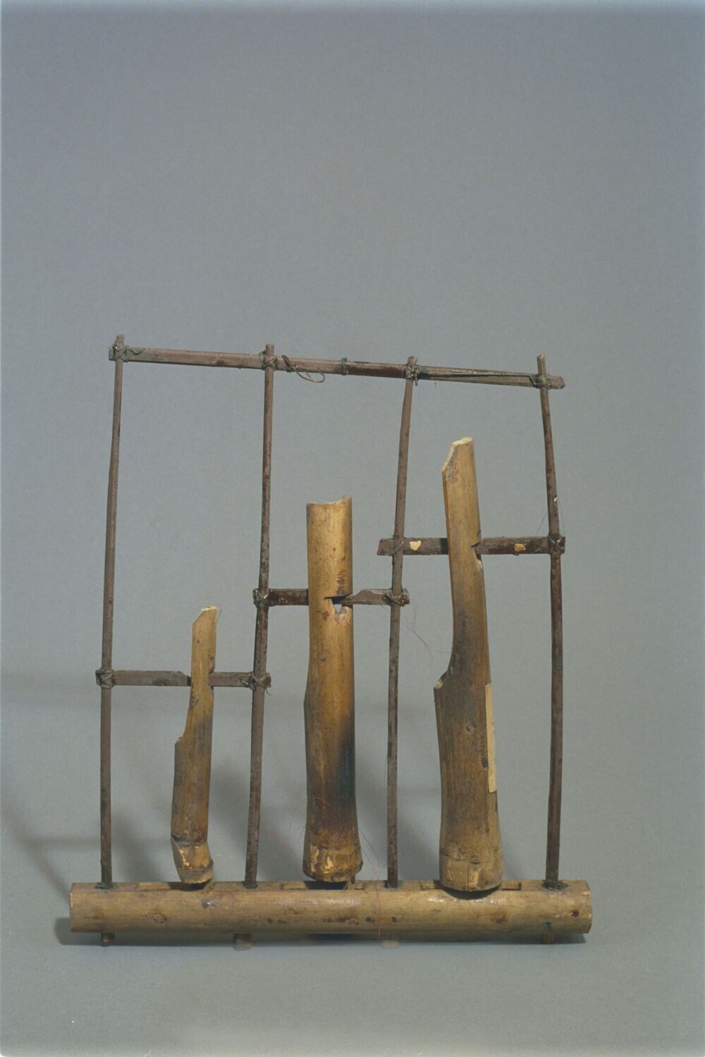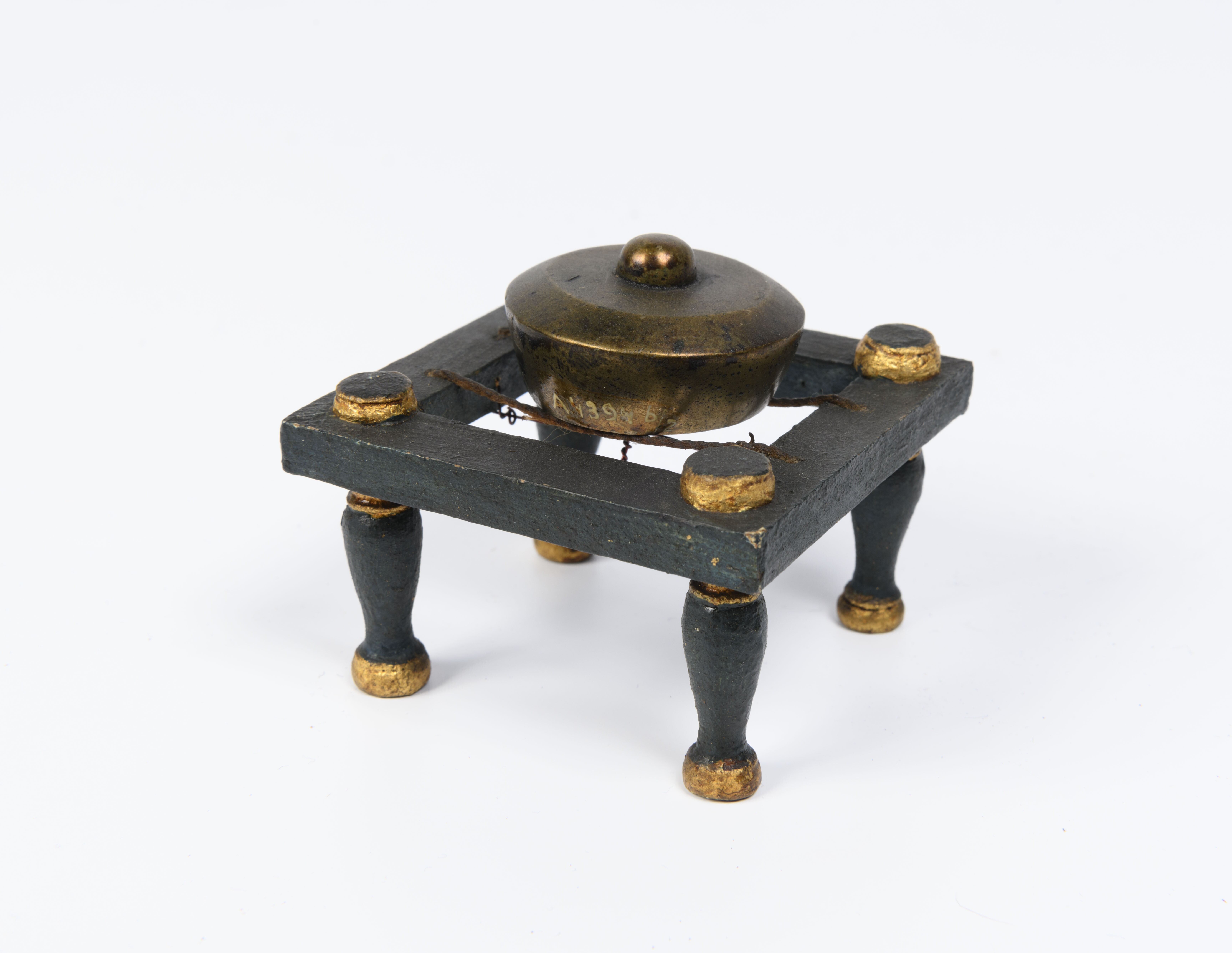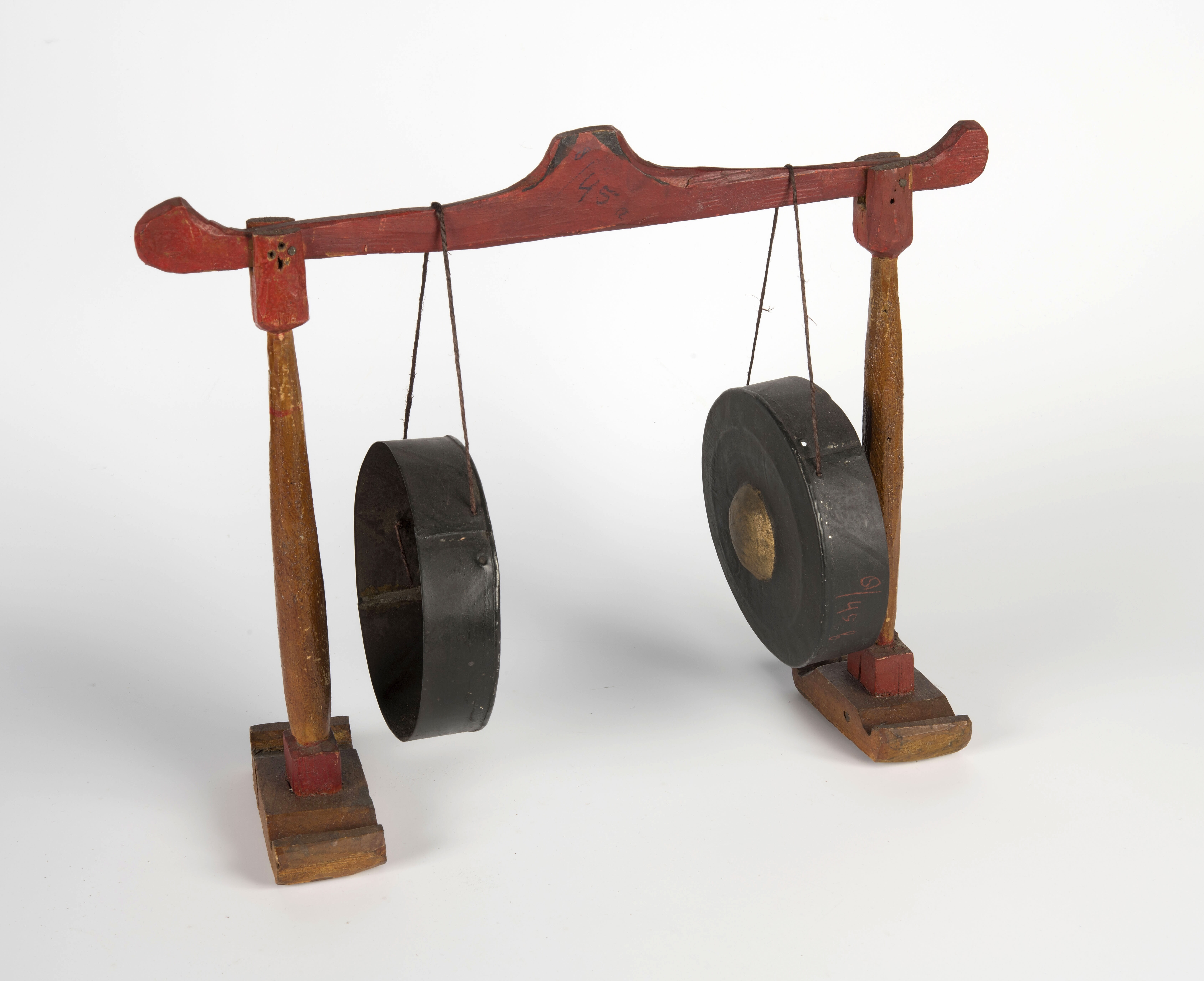 Model van hout van een stel gongs met standaard, ond...