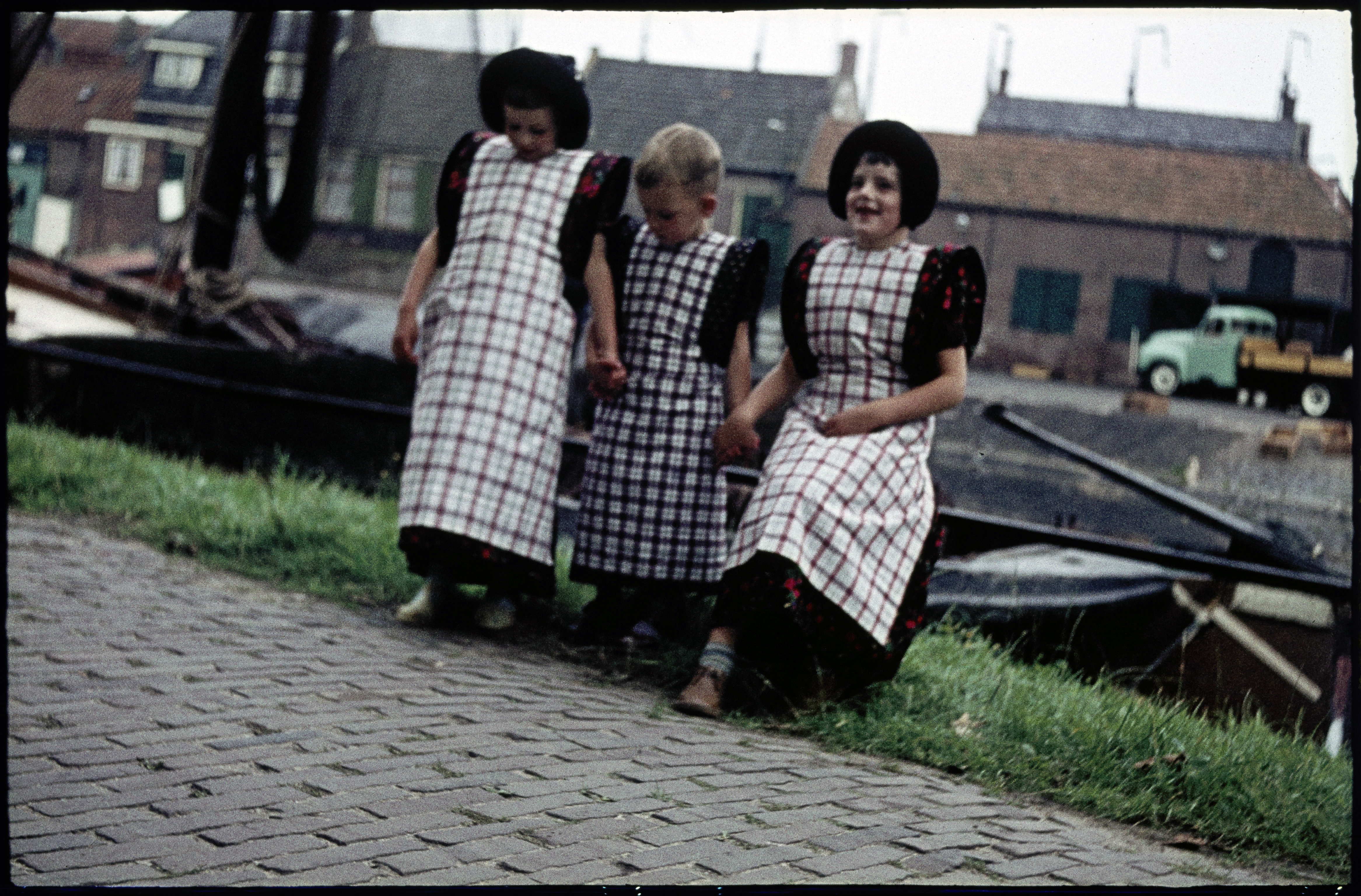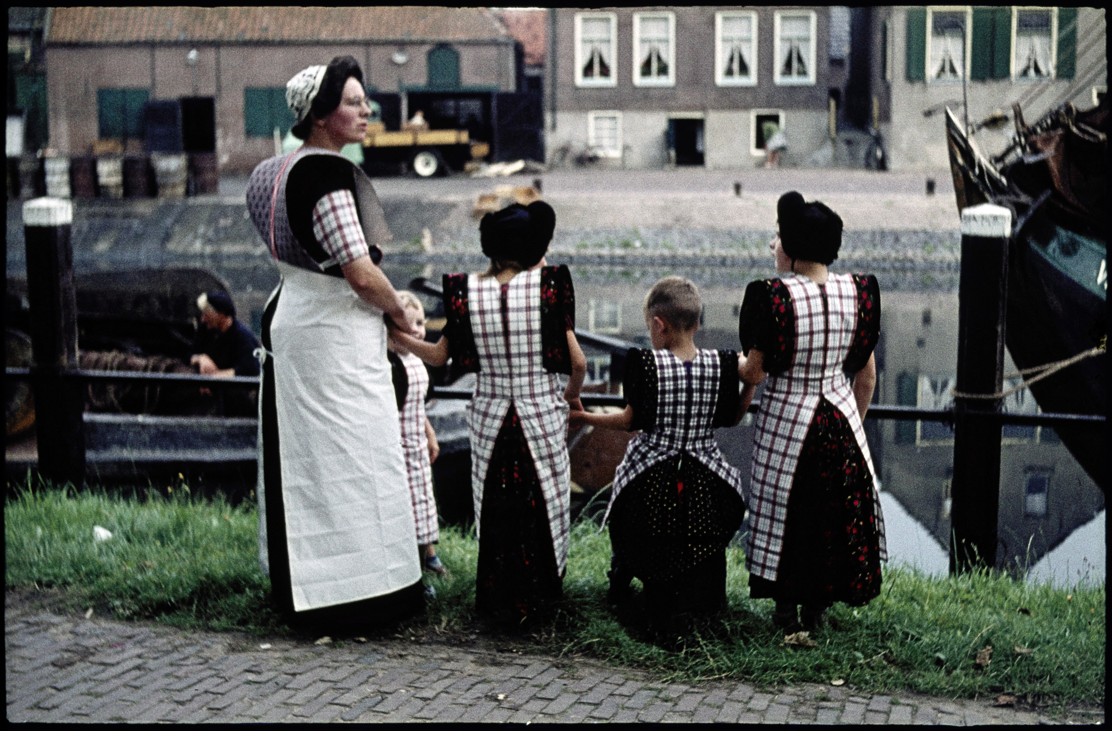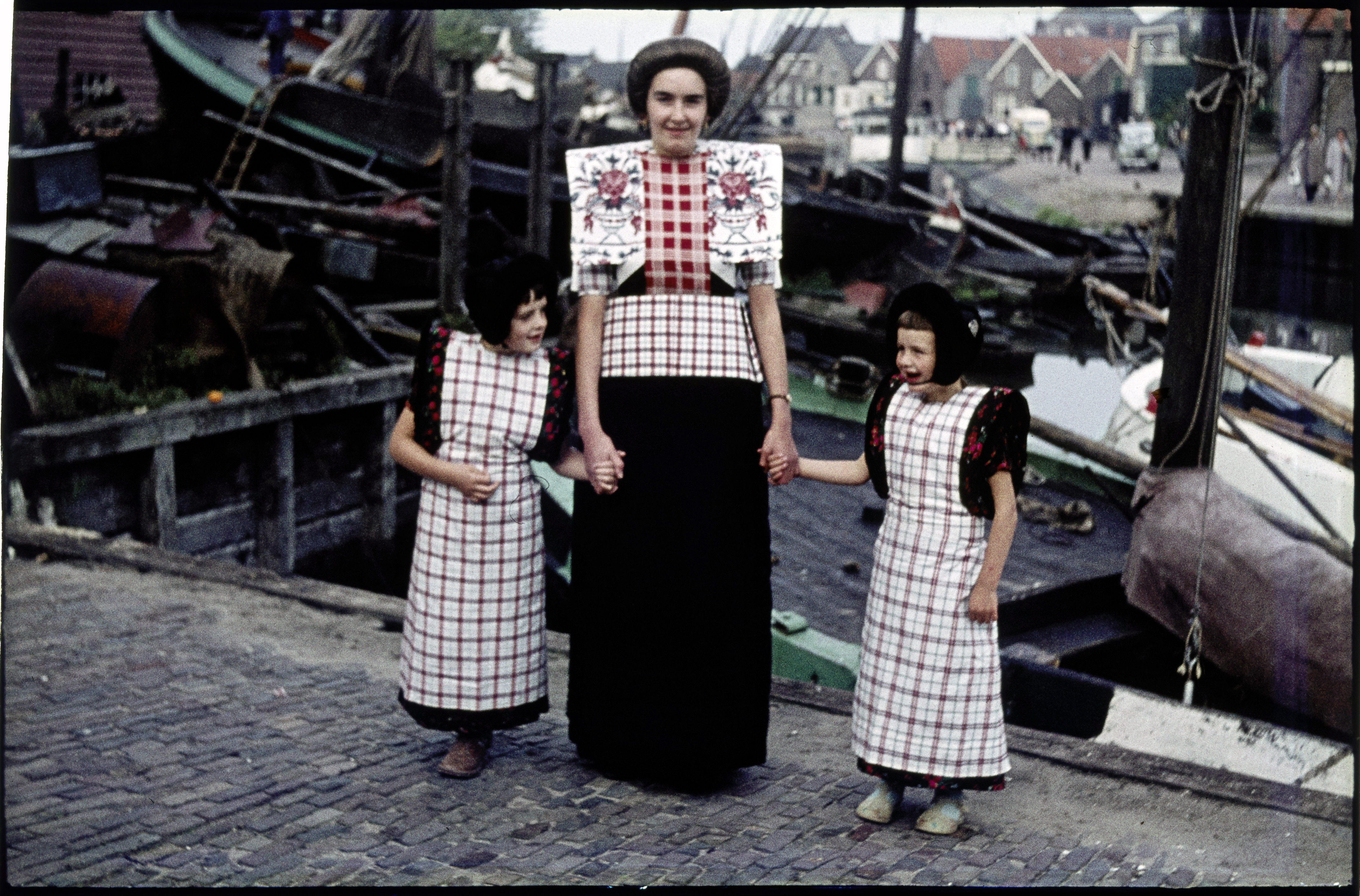 Vrouw met twee meisjes in klederdracht bij de haven