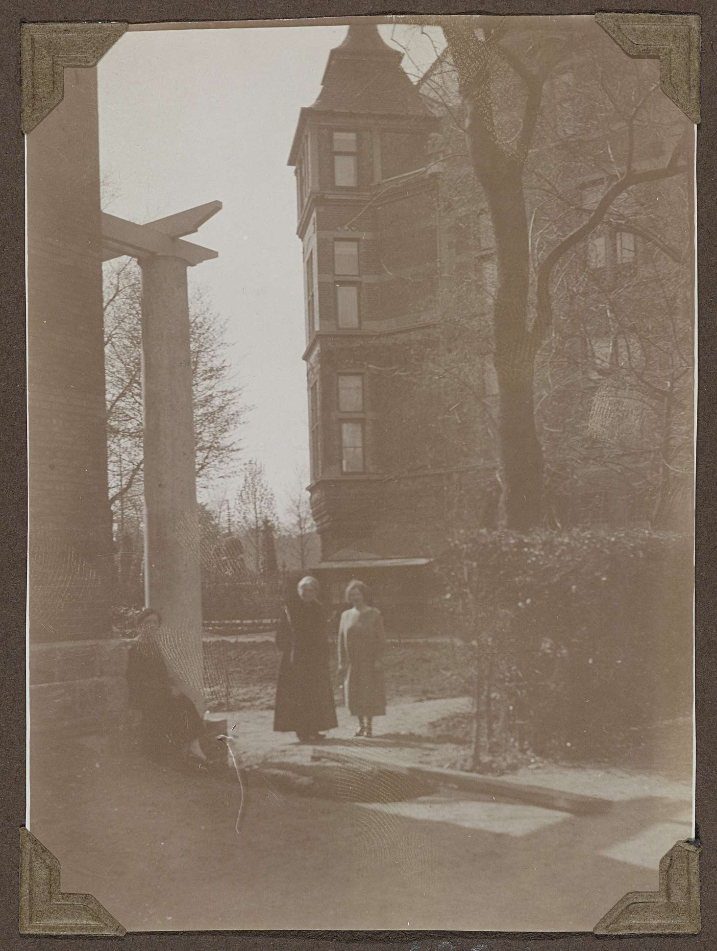 Drie dames poseren tussen de villa en de Teekenschoo...